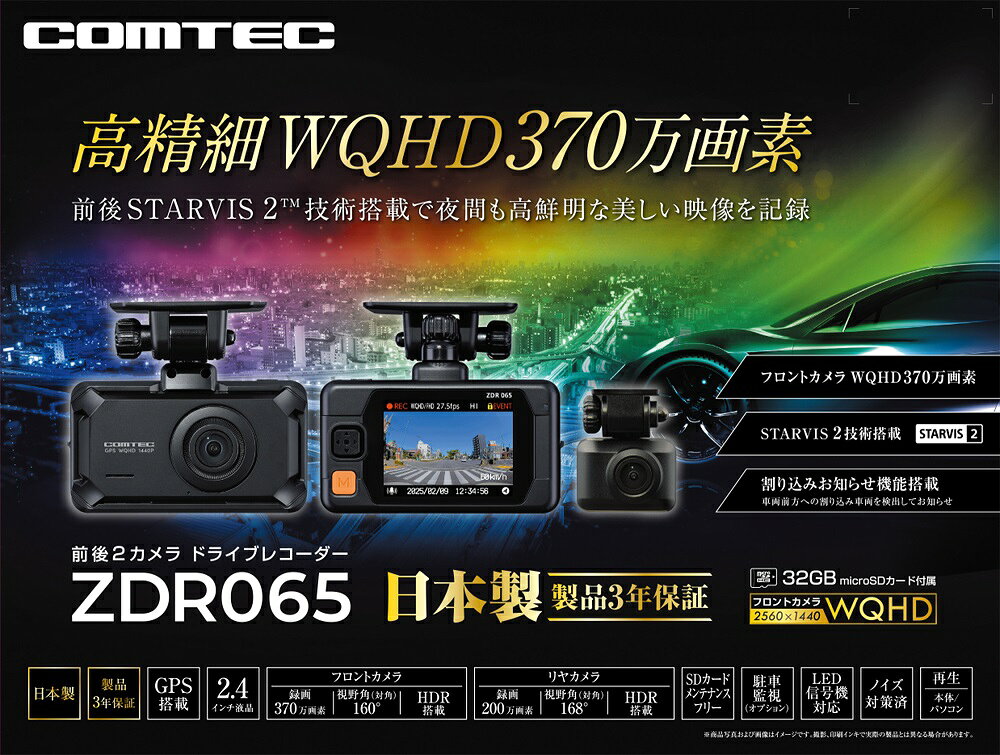 ★すぐに使える値引きクーポンあり コムテック ZDR065 前後ドラレコ 高精細WQHD370万画素 細部まで鮮明に記録 FullHDの約1.8倍 高解像度 microSDカードメンテナンスフリー2カメラ ZDR-065