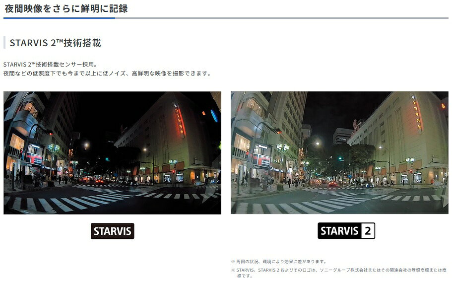 本体タイプ:一体型 カメラタイプ:前後2カメラ 画素数(フロント):有効画素数:最大370万画素/総画素数:500万画素 液晶サイズ:2.4型(インチ) 駐車監視機能:オプション 夜間映像をさらに鮮明に記録STARVIS 2技術搭載センサー採用。 夜間などの低照度下でも今まで以上に低ノイズ、高鮮明な映像を撮影できます。 WQHD370万画素 フロントカメラにはWQHD370万画素のセンサーを搭載。フルHD(200万画素)より約1.8倍高精細な映像で、周囲の状況を鮮明に記録します。 HDRで白とびなしHDR機能を搭載白とびなどの明暗差を補正し、逆光にも強くさまざまなシチュエーションで安定した映像を記録します。 ※ 周囲の状況、環境により効果に差があります。 夜間映像をより鮮明に記録STARVIS 2技術なら、夜間などの低照度下でも今まで以上に低ノイズ、高鮮明な映像を撮影できます。※ 周囲の状況、環境により効果に差があります。 割り込みお知らせ機能走行中の自車前方への割り込み車両を検出し、アラームでお知らせします。また設定により割り込み録画データとして記録することもできます最長24時間監視可能オプション:駐車監視・直接配線コード【HDROP-14】が必要運転支援機能8つの機能で快適なドライブをサポートドライブレコーダー向けデータ復旧サービスmicroSDカードメンテナンスフリー本製品の専用ファイルシステムは、パソコンなどで使用されているファイルシステム(FAT等)に比べ、microSDカード内データの断片化が起こりにくいファイルシステムとなっています。 そのためmicroSDカードを定期的にフォーマットせずに使用することができます。※ 本製品はmicroSDカードを定期フォーマットせずご使用いただけますが、microSDカードは消耗品のため、その特性上、フォーマットいただいた方がより長く使用することができます。バックアップ機能事故などで電源が切断しても、スーパーキャパシタによりファイルの破損を抑え、記録した映像を保護します。SDカードチェック機能(撮り逃し防止)多くのドライブレコーダーではSDカードが破損していても通常通り起動してしまい映像を記録できていないことがあります。本製品では起動時にmicroSDカードをチェックし、カードが破損していた場合は液晶表示で異常をお知らせするため、撮り逃しを防止できます。緊急録画停止機能事故等の大きな衝撃を受けた際、録画を自動で停止します。これにより重要な映像を上書きすることがありません。※ 衝撃検出感度はOFF含め11段階に調整できます通常録画もタイムラプス録画駐車監視モード時だけでなく、通常時もタイムラプス録画可能。1秒間に1枚記録することで長時間の記録が行えます。 また長時間の映像を短縮して再生できるように記録されるため、映像の確認も簡単です。GPS搭載で自車の走行速度や位置情報を録画データと共に記録します。また日時情報もGPSにより自動で補正されるため、設定を行う必要がありません。全国のLED信号機に対応地デジやナビに影響しにくいノイズ対策済み※商品の詳細や適合等は必ずメーカーホームページ等でご確認下さい
