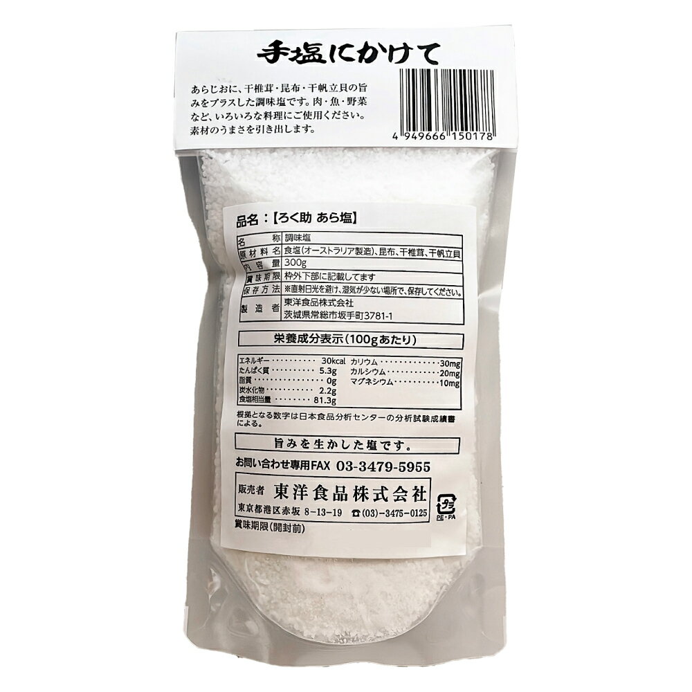 ろく助の塩 [1袋(300g)〜3袋(900g) ] 元祖 白塩 あら塩タイプ 塩 粗塩 お試し 大容量 調味料 ろくすけ 食塩 ろく助の塩 しお 「ろく助塩 あら塩」 JC メール便 送料無料 ろく助塩元味。ろく助塩の基本の味(あら塩タイプ) \メディアやSNSで話題の美味しいお塩/〜赤坂の名店”串焼き ろく助”の店主、高野正三氏が作り上げた特別な塩〜独自の製法で、昆布と椎茸の旨味を塩の中に凝縮した旨塩です。初めての方はこの塩でおにぎりを握って食べるとこの塩のよさがわかります。「ろく助塩」あら塩タイプは、加工の工程を省いたから、お得なプライスです。お家使い用に最適です!お料理の味付けには、そのままご使用いただけます。お料理に直接ふりかけたりする場合はミルをお使い下さい。■名称調味塩■原材料食塩(オーストラリア製造)、昆布、干椎茸、干帆立貝■賞味期限製造日より約10ヵ月(裏面に記載)■保存方法直射日光を避け、湿気が少ない場所で保存してください。■製造者東洋食品株式会社 茨城県常総市坂手町3781-1===調味料 旨塩 白塩 食品 あら塩 粗塩 rokusuke ミックス 万能 料理 アレンジ ドレッシング 炒め物 付け塩 焼き肉 焼き魚 焼き鳥 おにぎり ろく助 ろく助の塩 ろく助塩 ろくすけしお ろくすけのしお ろくすけの塩 六輔の塩 5