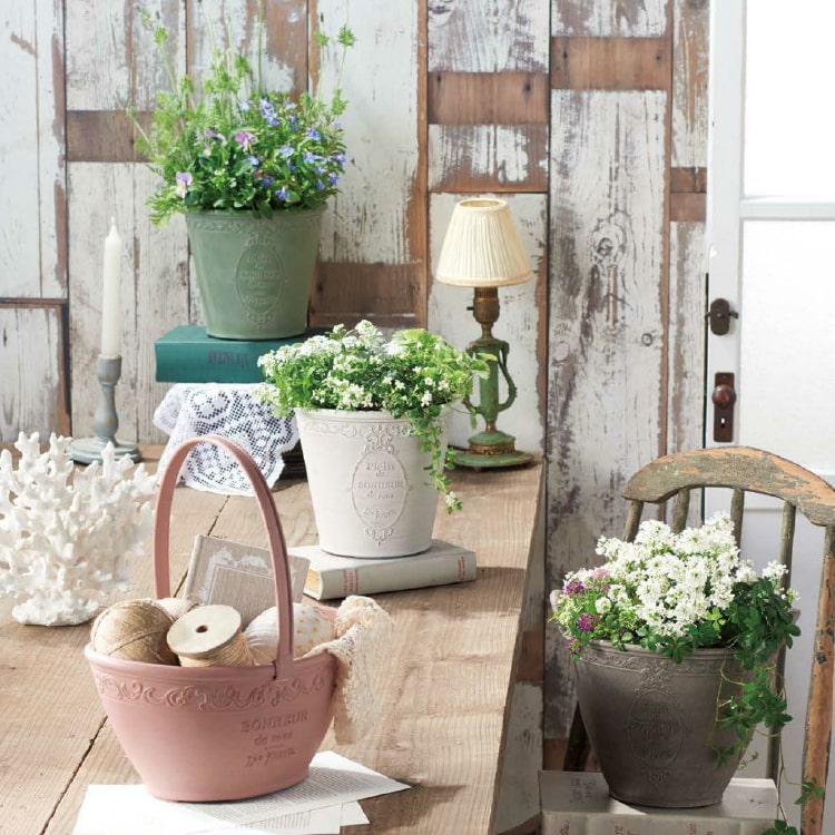 軽くて丈夫なプラスチック製の植木鉢 植物を飾りたいけれど重たいものは苦手、という場合には樹脂製のものがお勧め。こちらはプラスチック製でも十分な厚みがあり、しっかりとした材質です。 ヨーロピアンテイスト溢れるデザインがおしゃれです。5色ご用意しました。どの色も使いやすく、おしゃれな空間を演出してくれます。 植え込みにも、鉢カバーにも 内径は約18cmと6号サイズがすっぽり入るサイズとなっております。軽くて扱いやすいため、たびたびの場所変えも重い鉢に比べ容易くなるでしょう。 鉢底の穴だけでなく底裏に凹凸がついているので、底に湿気がこもるのを防ぎます。 控えめな装飾がおしゃれ アンティークな色合いとロゴがシンプルでありながらも、お洒落で嫌味のない好印象をもたらします。ロゴは片面のみ装飾されているのでよりシンプルにお使い頂く場合はロゴの無い面を正面にすると良いでしょう。 大きさが知りたい カラーラインナップ ホワイト チャコールグレー グリーン ピンク ベージュ ブラック ブルー シルバー 商品仕様 商品型番 UN009-195 サイズ 6.5号 / 19.5cm 鉢底穴 有り 受け皿 無し 材質 合成樹脂 重さ 400g この商品のサイズバリエーション 各サイズの商品ページへ移動できます。 6.5号(19.5cm) 8.5号(23.5cm) ご購入前にご確認ください