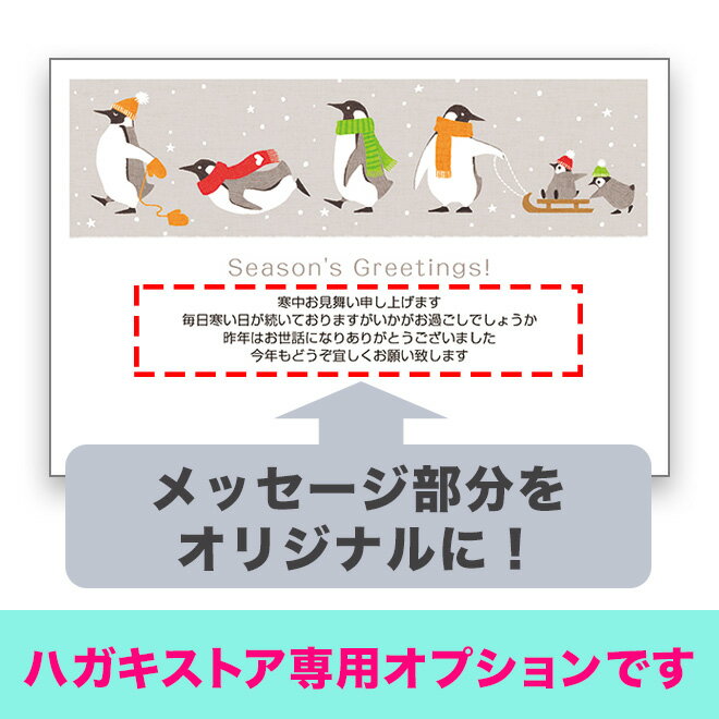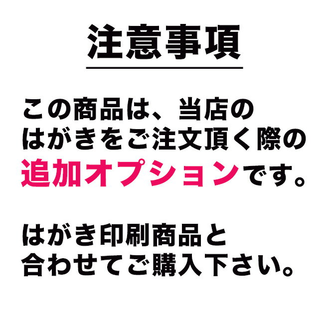 この商品は、当店のハガキをご注文頂く際の追加オプションです。 通常は固定のメッセージ文を印刷している商品も、このオプションを追加していただくことでオリジナル文章に変更できます。 【単体ではご注文いただけませんのでご注意下さい!!】 ▼▼購入の際は以下の注意事項をご確認くださいませ。▼▼ ・印刷前のサンプル確認はございません。誤字脱字にご注意の上、文章を作成ください。 ・文章内に絵文字や特殊記号はご使用いただけません。 ・文章が違うはがきを2パターン作成する場合はこのオプションを2点ご注文下さい。 ・ご注文の翌営業日に、当店よりメールをお送りします。そちらに記載ご希望の文章をご入力の上ご返信下さい。 ・メッセージ文より大きめの文字で書かれている部分(HAPPY NEW YEAR、暑中お見舞い申し上げます、など)は固定デザインのため変更できません。 ・ご返信頂いてから2営業日後の出荷となります。オプションなしのハガキをご注文いただいた場合より、数日納期が遅れますので、予めご了承下さいませ。