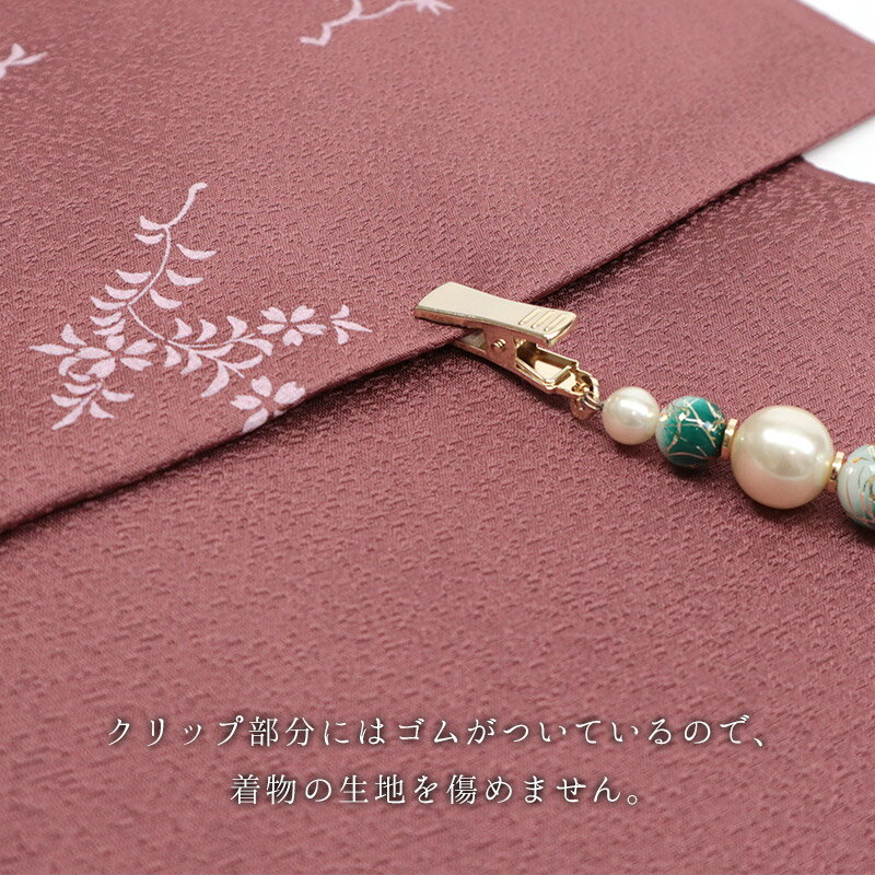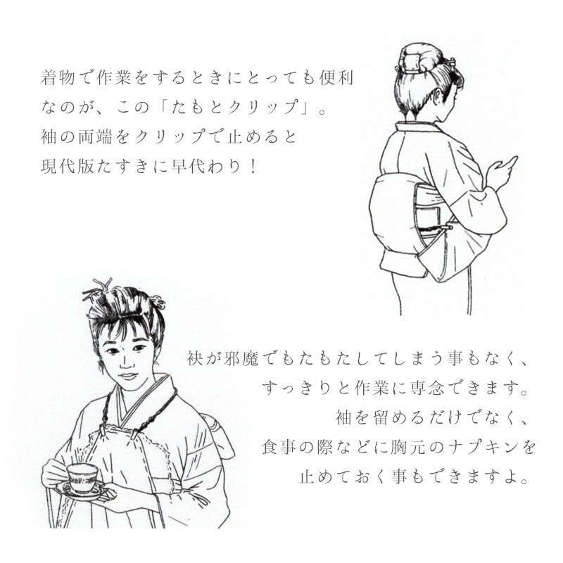 普段用のカラータイプと弔事に使えるモノクロタイプ 普段使いにピッタリ!たもとクリップ(カラー) 弔事にも使える!たもとクリップ(黒) 邪魔な袖をまとめます! 着物で作業をするときにとっても便利なのが、この「たもとクリップ」。 袖の両端をクリップで止めると現代版たすきに早代わり! 袂が邪魔で、もたもたしてしまう事もなく、すっきりと作業に専念できます。 袖だけでなく、ナプキンも 袖を留めるだけでなく、食事の際などに胸元のナプキンを止めておく事もできますよ。 お持ちのハンカチなどがお食事エプロンに早変わりです。 カラーは豊富な6種類 どの色もきらりと輝く色玉を使用しており、パール調の白玉にも負けない華やかさがあります。 おしゃれな袂クリップで、スッキリとした着物姿をかっこよく演出してくださいね! 長さが調節可能です 銀色の止め具でゴムの長さも調整OK。 シンプルなデザインなのでお好みによって普段から愛用しても大丈夫です。
