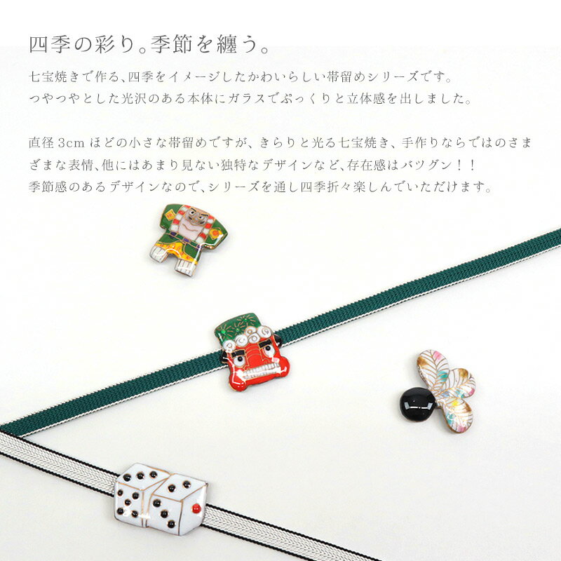 四季の彩り。季節を纏う。 七宝焼きで作る、日本の四季をイメージしたかわいらしい帯留めシリーズです。 つやつやとした光沢のある本体にガラスでぷっくりと立体感を出しました。 直径3cmほどの小さな帯留めですが、きらりと光る七宝焼き、手作りならではのさまざまな表情、他にはあまり見ないデザインなど、存在感はバツグン!! 季節感のあるデザインなので、シリーズを通し四季折々楽しんでいただけます。 お正月や冬のモチーフたっぷり 獅子舞にだるま、凧あげに羽根突きなどお正月のモチーフを集めた七宝焼きシリーズ。 だるまはおめでたい席に、獅子舞は2月の節分の時期にも使えますね。 暑い日に手軽に風を感じられる日本独特のアイテム 普段着やちょっとしたお出かけなどカジュアルな装いにお使いください。 愛らしい小物は身につけているだけで楽しくなりますね。 二分紐、三分紐、四分紐がご使用いただけます。 ※メール便をご希望の場合はケースなしでのお届けとなります。