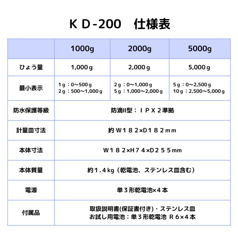 ■スペック メーカー:タニタ ◯KD-200 1000g ひょう量:1,000g 最小表示:1g:0~500g 2g:500~1,000g ◯KD-200 2000g ひょう量:2,000g 最小表示:2g:0~1,000g 5g:1,000~2,000g ◯KD-200 5000g ひょう量:5,000g 最小表示:5g:0~2,500g 10g:2,500~5,000g 防水保護等級:防滴2型 IPX2準拠 文字高:液晶表示 14mm 電源:単3形乾電池×4本 オートパワーオフ:約10分 計量皿寸法:約 W182×D182mm 本体寸法:W182×H74×D255mm 本体質量:約1.4kg(乾電池、ステンレス皿含む) 付属品:取扱説明書(保証書付き)・ステンレス皿、お試し用電池(単3形乾電池 R6×4本) ●IPX2の防滴構造 ●アルカリ乾電池使用で連続10,000時間使用可能 ●オートパワーオフ機能 ●風袋引き機能付 【オートパワーオフ機能】 本製品は、同じ表示が約10分間続くと、自動的に電源が切れるオートパワーオフ機能を備えています。 【取引証明以外用】 このはかりは、取引証明以外用です。 品物の売買取引や、公にその物の目方を証明する場合は、ご使用にならないでください。 【防塵・防水性能】 IPX2とは、 4方向(前後左右)に15度傾け、上方200mmの高さから毎分3mmの降水量で、各方向2.5分間ずつ滴下させても、有害な影響がないもの。 ■水に接触させて使用する商品や、水まわりで使用する商品には、水によって機能に影響が出ないように防水性能が要求されます。 また、粉塵によって機能に影響が出ないように防塵性能も同時に要求される場合があります。 ご注文の際は、使用される環境に合った保護等級の商品をお選びください。 ※モニターの発色によって実際の色味と異なる場合があります