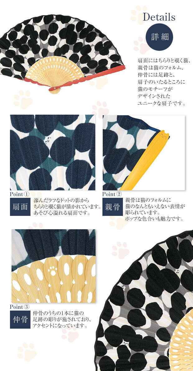 配送について 返品・交換について 特徴-feature- ラフなドット柄にちらりと覗くねこがユニークな生地扇子。 猫の愛らしさをふんだんに感じられる仙骨(せんこつ)のフォルム、仲骨にも、くすっと微笑ましいチャームポイントが。遊び心が溢れた一本。 オプション-option- 扇子名入れサービス(¥500+税) 当店の扇子へお名前を入れるサービスです。ご希望の場合、名入れしたい扇子を買い物かごへ追加後、こちらを併せてご注文ください。 扇子名入れサービス ラッピング・熨斗(のし) 無料のラッピング・熨斗サービスを承っております。商品オプションよりご希望ください。母の日・父の日期間限定のラッピングもご用意しております。 ラッピング・熨斗サービス 仕様-spec- 品名 ハイドキャット 扇子セット 内容 生地扇子(片面貼り)扇子袋紙箱 サイズ 扇子:約21cm 袋:約23cm 素材 扇面:ポリエステル 扇骨:竹 製造国 中国製(企画/デザイン:日本) ご注意 お使いのPC・スマートフォンによっては、商品画像と実際の商品の色合いが異なる場合がございます。 制作時期によりデザイン・仕様が一部変更となることがございます。 天然素材を使用した手作業による商品のため、柄の出方や染め具合に一点一点個体差が生じる場合がございます。 ■関連キーワード ○扇子は「末広がり」の縁起物 ○着物や浴衣など和服とのコーディネート ○お祝いの品、贈り物として 誕生日祝い/還暦祝い/古希祝い/喜寿祝い/傘寿祝い/米寿祝い/卒業祝い/成人祝い/結婚祝い/内祝い/就職祝い/昇進祝い/退職祝い/定年祝い/勤続祝い/周年記念/暑中見舞い/引き出物/お土産/海外へのお土産/夏祭り/お中元/記念日/母の日/父の日/成人の日/敬老の日/プレゼント/ギフト/贈り物/ノベルティ/お名前入れ/名入れ/名前刻印/和小物/和雑貨/京扇子/伝統工芸/京都/縁起物/熨斗/おしゃれ/かわいい/レディース/普段使い/女性向け/婦人用/猫/ネコ/ねこ/キャット/動物/生き物/ネイビー/紺/青/ブラック/黒/ポップ/カジュアル/デイリーユース/人気/生地扇子