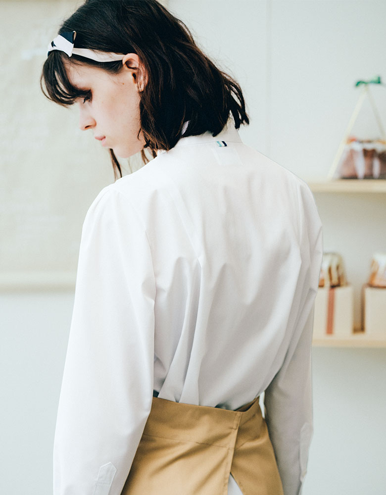 ●製品紹介情報 使用素材 ポプリン(PETボトル再生繊維) ポリエステル65%綿35% 商品詳細 前にも後ろにもタックを入れて、ふんわりしたシルエットのブラウス。 きちんと感がでるウィングカラーが特徴的 袖山のタックが、シンプルなフォルムのアクセントに 着丈 バスト 肩巾 袖丈 5 62 109 36 57 7 63 113 37 58 9 64 117 38 59 11 65 121 39 60 13 65 125 40 60 15 65 131 41 60
