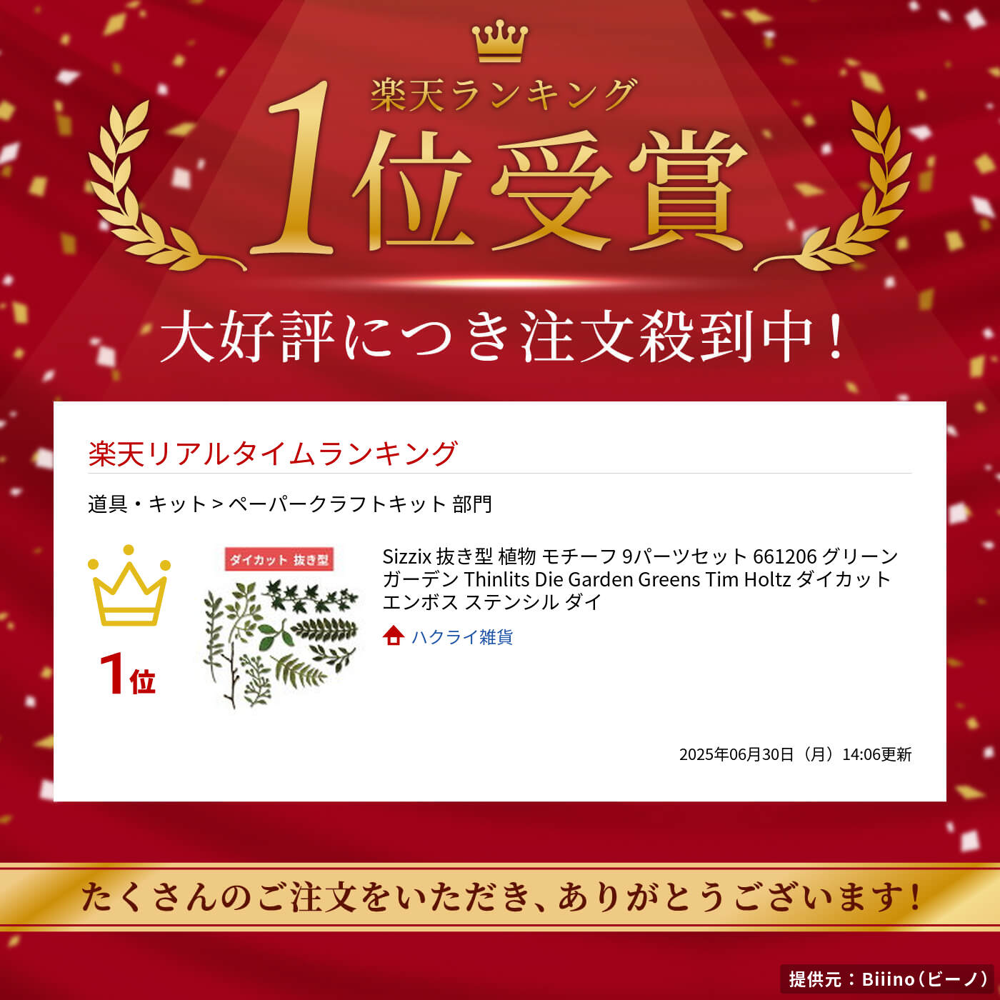 型番661206特徴◆植物モチーフ 9パーツセット ◆デザイン:Tim Holtz ◆Thinlits (シンリッツ)シリーズ ◆繊細なカットエッジで、モチーフがきれいに切り抜ける。 ◆作品のクオリティが格段に上がる、緻密で美しいデザイン。 ◆カード、アルバム、スクラップブック、ラッピング、デコレーション、招待状、アートなどに。サイズ約10.8cm x 3.8cm ~ 3.8cm x 3.2cm素材/材質金属製ご注意※ご使用には、ダイカットマシンや他のアクセサリ(別売り)が必要です。 ※はじめは薄い紙からお試しください。 ※特定の素材をダイカットできるかどうかわからない場合は、マシンではなく抜き型の互換性を確認してください。 ※厚手の紙や素材、紙を重ねるなどのカットは避けてください。マシンやダイの故障の原因になります。 ※フレームで手を切らないようにご注意ください。 ※サイズや、適応マシンを十分にお確かめの上ご購入ください。 ※海外製品のため、若干の傷や擦れがある場合があります。 【 Sizzix 抜き型 植物 9パーツセット 661206 Thinlits Garden Greens by Tim Holtz 】 ◆Sizzix Thinlits ダイカット 抜き型 植物モチーフ グリーンガーデン ◆9パーツセット。 ◆緻密で美しいデザインが特徴。 ◆ステンシルやエンボス加工にもご使用いただけます。(別途ツールをご用意ください) ◆カード、アルバム、スクラップブック、ラッピング、デコレーション、招待状、アートなどに。 <ご注意> ※ご使用には、ダイカットマシンや他のアクセサリ(別売り)が必要です。 ※厚手の紙や素材、紙を重ねるなどのカットは避けてください。マシンやダイの故障の原因になります。 ※とても繊細なデザインのため、一度で切り抜けない場合は数回マシンに通してください。 ※手を切らないようにご注意ください。 ※サイズや、適応マシンを十分にお確かめの上ご購入ください。 ※海外製品のため、若干の傷や擦れがある場合があります。 ◆当店では、他にも様々なモチーフの抜き型やダイカットマシン等、Sizzix製品を多数取り扱っております。是非合わせてご覧ください。Sizzix 抜き型 ◆ 植物モチーフ グリーンガーデン 9パーツセット◆ダイカット 抜き型 植物モチーフ グリーンガーデン ◆9パーツ入り ◆Sizzixの高品質な抜き型、「Thinlits (シンリッツ)」シリーズ ※画像は作品例です。◆緻密で美しいデザインが特徴。 ◆ステンシルやエンボス加工にもご使用いただけます。(別途ツールをご用意ください) ◆カード、アルバム、スクラップブック、ラッピング、デコレーション、招待状、アートなどに。◆Sizzix Thinlits (シンリッツ)シリーズについて: 薄い金属製の抜き型です。 繊細なデザインのモチーフを切り抜くことができます。 型自体が薄く刃も浅いため、切り抜ける素材は薄手のものに限られますが、その分緻密なカットを実現し、切断面がきれいに仕上がります。 デザインの種類も豊富で、クオリティの高い作品作りにおすすめです。 ステンシルやエンボス加工にもご使用いただけます。(別途目的に合ったツールをご用意ください) ※特定の素材をカットできるかどうかわからない場合は、マシンではなく抜き型の互換性を確認してください。 ※とても繊細なデザインのため、一度で切り抜けない場合は数回マシンに通してください。 ※紙からモチーフが抜けにくい場合は、ダイと素材の間にワックスペーパーを置いてからカットすると効果的です。 ◆当店では、他にも様々なモチーフの抜き型やダイカットマシン等、Sizzix製品を多数取り扱っております。是非合わせてご覧ください。◆使い方◆◆ダイカットとは: ダイカットマシンとダイ (抜き型) を使用して、紙などの素材からモチーフを型抜きする手法です。 <使い方> 1.ダイカットマシン(推奨:Sizzix Big Shot)と、カッティングプレート2枚 (型番:655093) をご用意ください。 2.カッティングパッド1枚の上に、抜き型を置きます。 3.紙を抜き型の上に置き、2枚目のカッティングプレートを一番上に重ねます。 4.ダイカットマシンに通し、圧力をかければ、型通りのモチーフを切り抜くことができます。 注: ●Sizzix Big Shot 等のマシンを使用する場合は、土台プレート (アダプタープラットフォーム 型番:658992) が必要になります。 ※すでにSizzix Big Shotマシンをお持ちの場合は、カッティングプレートとアダプターが含まれています。 ●画像内の抜き型は、サンプルイメージとしてサークル形が使用されています。 ※本セットにはサークル形は含まれません。<ご注意> ※ご使用には、ダイカットマシンや他のアクセサリ(別売り)が必要です。 ※厚手の紙や素材、紙を重ねるなどのカットは避けてください。マシンやダイの故障の原因になります。 ※フレームで手を切らないようにご注意ください。 ※サイズや、適応マシンを十分にお確かめの上ご購入ください。 ※海外製品のため、若干の傷や擦れがある場合があります。
