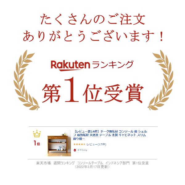 チーク無垢材100%使用 リビング、キッチンで活躍しそうな 3ドロワーコンソール 高級材料チーク無垢材を100%使用した 引き出し3つタイプのオリジナルコンソールです リビングやキッチンで活躍しそうな 実用性の高い仕様に仕上がっています 奥行35cmというスリムサイズもポイントです 使えば使うほどチーク材の木の味わいが出てきます 商品詳細 商品名 チークコンソール3ドロワー 商品番号 wat7713 全体のサイズ(cm) 幅100×奥行35×高さ82.5 天板のサイズ 幅100×奥行35 引出内のサイズ 幅25×奥行26.5×深さ8 オープン棚のサイズ 幅88×奥行30.5 ※落下防止用の桟の高さ:3 空間高さ 上段)17 下段)35.5 脚下空間高さ 10 棚板の厚み 2 材質 チーク 重量 23kg 塗装 シェラック 組立状態 完成品 生産国 インドネシア ※サイズ・重量はおおよその値です 一つずつ手作業での生産につき多少の違いはご了承ください - 備考 - 床の傷防止フェルトを貼ってお届けします 天然木使用のため、木目や節など1本1本異なります ディスプレイによる色の違いはご了承下さい - その他のサイズはこちら - チークコンソール2ドロワー お届け地域による料金表はこちらをご覧下さい >> 「コンソールテーブル」はこちら >> 「棚・シェルフ」はこちらカッコ良さバツグン! 奥行35cmのスリムサイズもポイント