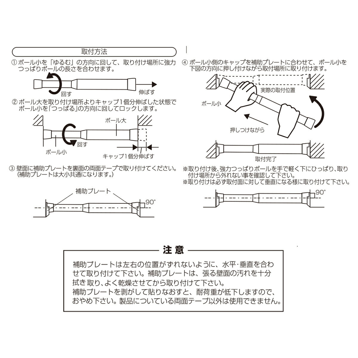 型番I7909 商品説明ポールを任意の方向へ回すことで簡単にロック、解除ができるワンロック構造を採用!本体にはアルミを使用している為、耐久性に優れています。スプリングにステンレスを使っているので、水回りでも使用いただけます。 【カラー】木目 【耐荷重】 ポール使用長さ72〜90cm:20kg(補助プレート使用) ポール使用長さ91〜110cm:18kg(補助プレート使用) ポール使用長さ111〜120cm:16kg(補助プレート使用) 寸法伸縮サイズ:72〜120cm ポール径:28mm 重量331g 補足事項表示の範囲内での寸法で取り付けて下さい。ポールに均等に荷重をかけるようにご使用下さい。誤って1ヶ所に集中して荷重をかけると、落下する恐れがあります特に中央部は絶対にお避け下さい。取り付け後は定期的につっぱり状態を確かめ、弱い場合は再度取り付けを行い、つっぱり強度を高めてください。熱を発する物のそばには取付けないでください。破損、変形の恐れがあります。強力につっぱって取り付けますので、取付面の下地がしっかりしている所で取り付けてください。取付面が石膏ボードやベニヤなど弱い壁の場合、破損や落下の恐れがあります。やむ得ず下地が弱い所に取り付ける場合は、15cm角程度のあて板(市販の木材等)を使用してください。本体の分解・改造及び部品の改造は絶対にしないでください。この製品は室内でのみご使用してください。タイル面やサッシ面は滑る場合がございますので、必ずお拭きの上、取り付けてください。本体を強い力で引っ張ったり、ぶら下がったりしますと、破損、落下の原因になりますのでおやめください。万一の落下に備え、貴重品、壊れやすい物は置いたり、掛けたりしないでください。耐荷重はポールに分散荷重をかけた時の目安です。