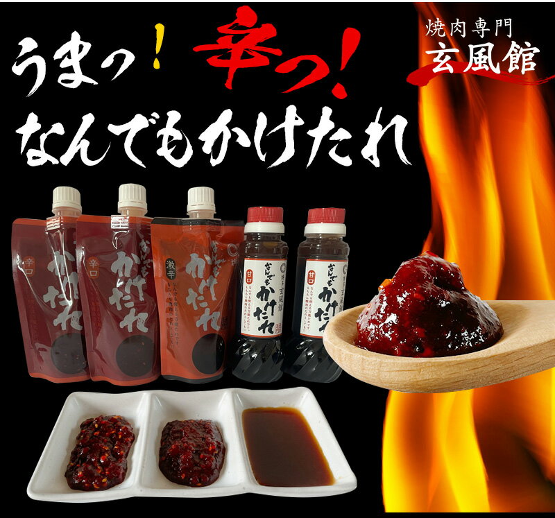 玄風館 タレ なんでもかけたれ おすすめ5本セット 送料無料 福岡 3種 5本 なんでもかけたれ 焼肉玄風館 ゲンフウカン 焼肉のたれ タレ にんにく 辛口 200g 激辛200g 甘口200ml 甘口 辛口 激辛 万能 調味料 お取り寄せ メディアで紹介 (熨斗対応不可) (北海道・沖縄別途送料)
