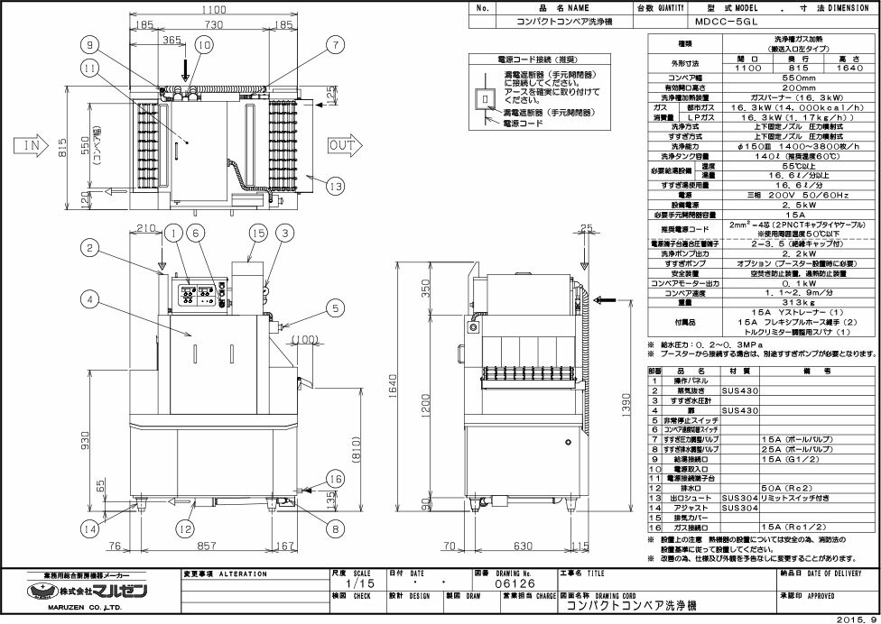 商品情報商品名:コンパクトコンベア洗浄機 MDCC-5GL外形寸法:幅1100×奥行815×高さ1560(mm)定格電源(50/60Hz):三相200V必要手元開閉器容量:15A重量(kg):313ガス接続口:15Aコンベア幅(mm):550洗浄能力(p150皿/h):1400~3800有効開口高さ:200必要給湯設備:温度55度以上湯量16.6L/分以上設備電源:2.5kW給湯接続口:15A槽排水口:50A●右タイプはこちら配送料について配送先ご住所と数量により配送料金が異なります為、配送料金は別途御見積となります。ご注文確認後、納期と配送料金をご連絡させて頂きます。※自動配信メールの金額には配送料金は含まれておりません。商品は車上渡しでのお届けです。※配送にはドライバー1名で伺います為、トラック上からの荷降ろしや、建物内への搬入及び開梱作業は行えません。大型商品の場合は、配送日当日に人手をご用意して頂きますようお願い致します。価格には搬入設置費および処分費は含まれておりません。搬入設置・処分等を御希望のお客様は、別途お見積り致します。お気軽にお問合わせください。尚、搬入設置を承れない地域がございます。予めご了承下さい。【ご注意】画面上の色はブラウザやご使用のパソコンの設定により実物と異なる場合があります。