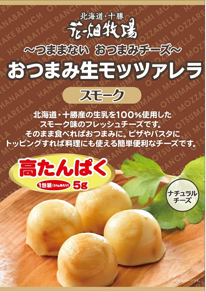 ■ひとくち生モッツァレラ スモーク 【種類別】ナチュラルチーズ 【内容量】24g×20個 【賞味期限】製造日から冷蔵60日 【保存方法】10℃以下で冷蔵保存 【原材料名】生乳(北海道産)、食塩/くん液、カラメル色素、(一部に乳成分を含む) 【栄養成分表示(1包装24g当たり)】熱量74kcal、たんぱく質5.5g、脂質5.3g、炭水化物0.9g、食塩相当量0.3g 【製造者】株式会社 花畑牧場 北海道河西郡中札内村元札内東4線311‐6 【製造所】株式会社 花畑牧場 第一工場(十勝工場) 北海道河東郡音更町東通20-3-3 ※商品の改訂などにより、商品パッケージの記載内容と異なる場合があります。■おつまみ生モッツァレラ スモーク 高たんぱく1包装24あたり5g!北海道・十勝産の生乳100%使用したフレッシュフーズです。そのまま食べればおつまみに。ピザやパスタにトッピングすれば料理にも使える簡単便利なチーズです。