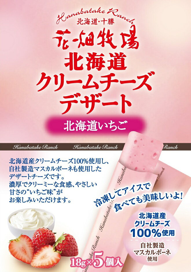 ■北海道クリームチーズデザート 北海道いちご 【名称】乳等を主要原料とする食品 【無脂乳固形分】6.5% 【乳脂肪分】17.5% 【内容量】90g(18g×5個) 【賞味期限】製造日より冷蔵90日 【保存方法】10℃以下で冷蔵保存 【原材料名】クリームチーズ(国内製造)、砂糖、卵白、マスカルポーネチーズ、果実加工品(糖漬け乾燥クランベリー、ぶどう糖)、レモンジュース(濃縮還元)、寒天、乾燥いちご(いちご(北海道産))/増粘剤(加工でん粉、キサンタン)、着色料(クチナシ)、安定剤(増粘多糖類)、香料、乳化剤、(一部に卵・乳成分を含む) ※商品の改訂などにより、商品パッケージの記載内容と異なる場合があります。 【製造者】株式会社 花畑牧場 北海道河西郡中札内村元札内東4線311‐6■北海道クリームチーズデザート 北海道いちご 北海道産クリームチーズ100%、自社製造マスカルポーネを使用したデザートです。濃厚でクリーミーな食感、やさしい甘さの”いちご味”がお楽しみ頂けます。