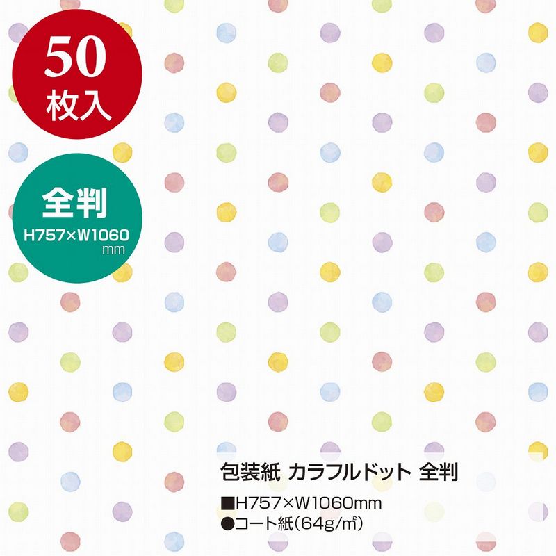 【サイズ】縦757mm×横1060mm50枚袋入材質:コート紙(64g/m2)包装紙カラフルドット全判です。サイズは大きなギフト(ビッグサイズ)を包装するのに最適な縦757mm×横1060mmで、表面に光沢のあるコート紙を使用しています。白地に水彩タッチのカラフルな水玉柄のデザインは、優しい印象があり、ベビー用品などの様々なギフトシーンでお使いいただけます。ササガワホームページ内の「レッツラッピング」サイトではおしゃれなリボンやシールなどと組み合わせたオリジナルのラッピングの包み方などを掲載しております。包装に必要な大きさを調べる「包装紙の大きさチェッカー」もあります。1包50枚入りの三つ折り仕立てです。【はなどんやお取り扱い商品について】■はなどんや掲載商品には、在庫品とメーカーお取寄商品がございます。掲載納期をご参考にされて下さい。即日発送の納期が記載されている商品でも、当店在庫が欠品となった場合には、お取り寄せにてご手配を進めさせていただきます。※コンビニ支払い・銀行振込等、前払い決済でのご注文については即日発送の対象外となります。■他店舗でも販売をしているため、また、メーカーの実在庫欠品等によりご注文後にご用意ができなくなる場合がございます。その場合にはメールにてご案内をさせて頂きます。■分納は承っておりません。一番遅い納期の商品に合わせて発送となります。/【VAR:71775】20221130newラッピング用品 、梱包資材 ラッピングペーパー(包装紙) 包装紙(平判)/
