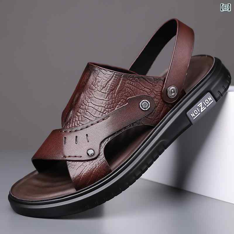 ・カテゴリ: サンダル・対象性別: 男性・対象年齢: 成人・スタイル: ビーチ・アッパー素材: 牛革(二層)・革質特徴: 牛床革(型押し)・裏地素材: レザー・インソール素材: PU・靴底素材: ポリウレタン・靴底製法: インジェクションモールディング・つま先形状: オープントゥ・ヒール形状: フラットヒール・ヒール高さ: 約1-3cm・筒丈: ローカット・留め具: スリッポン/サンダル両用・機能: 通気性、防水、防滑・加工方法: フィルム加工革・柄: エンボス加工・厚み: 標準・カラー展開: ブラック、ブラウン・サイズ展開: 38、39、40、41、42、43、44
