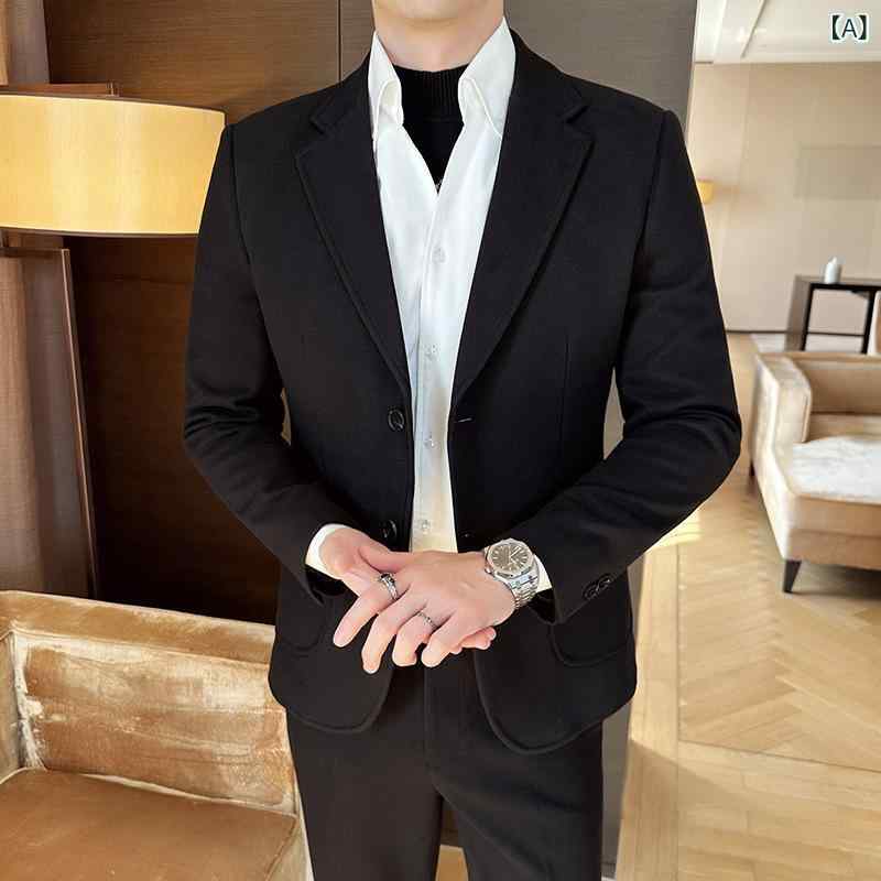 ・スタイル: スマートビジネス・留め具: シングルブレスト2つボタン・季節: オールシーズン・主要素材: ウール混、ビスコース32%・シーン: カジュアル・襟型: ノッチドラペル・スリット: センターベント・フィット: スリムフィット・厚さ: 厚手・デザインディテール: ボタン装飾・カラー展開: ブラック、ダークグレー、コーヒー・サイズ展開: M, L, XL, XXL, XXXL, 4XL, 5XL, 6XL, 7XL・縫製: 接着芯地加工