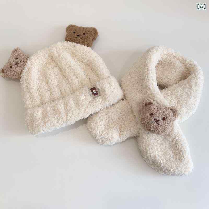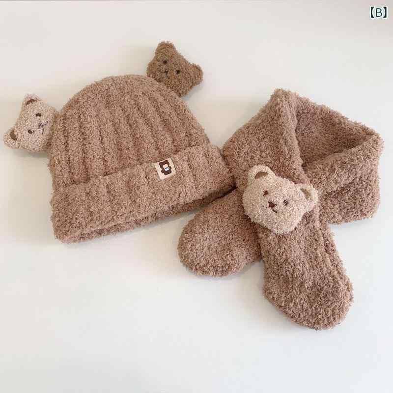 ニット帽 ベビー キッズ 子供用 赤ちゃん くま ふわふわ モコモコ マフラー ネックウォーマー 2点セット 耳当て付き 秋冬 冬用 防寒 あったか 防風 ポリエステル かわいい(x2)