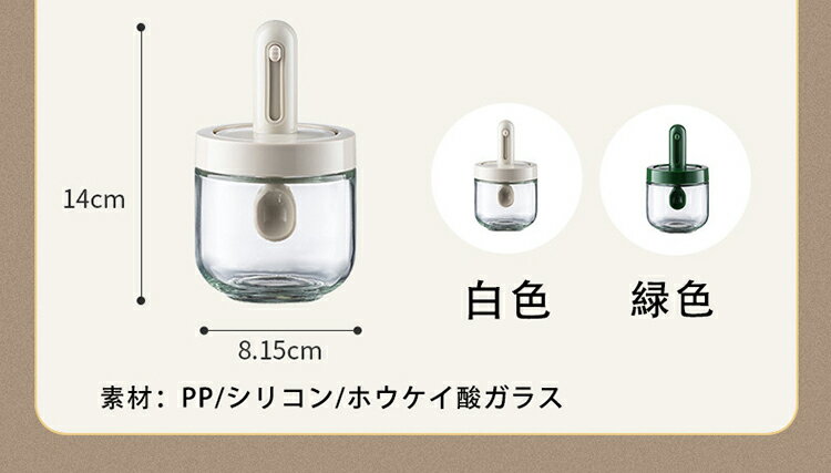 商品詳細 サイズ 本体サイズ:直径8.15×H14cm 容量:300ml 商品説明 伸縮可能スプーン付き フタと一体になる、伸縮で長さを調節できるスプーン付き。調味料が満杯になっても気楽に蓋を閉めます。一番下まで届きますので調味料を使い切ることができます。 高いの密封性 蓋の間にシリコンリング付き、調味料入れの密封性を高め、空気中の水分の侵入を防止、調味料の乾燥性を維持します。 ぴったり2g スプーン1杯に2g、料理中ゲージスプーンとして使える、どれくらいの調味料入れたのが把握できます、味が足りないや濃いすぎの可能性を減ります。 安心安全な材質 グラスの部分だけではなく、スプーンやフタなど、全パーツが日本の食品衛生法基準による検査を通過、安心で安全な材質を使用します。 素材等 ガラス/PP/シリコン 注意事項 ※商品の色はモニターの具合で実物と若干異なる場合がございます。予めご了承下さい。 ※真空にする際はしっかりと蓋を閉めてください。 ※蓋はすすいだり、水に浸さないでください。真空効果が弱くなる恐れがあります。 ※液体を入れる場合は、冷凍庫で使用せず、粗熱を取ってから冷蔵庫で保管してください。商品詳細 サイズ 本体サイズ:直径8.15×H14cm 容量:300ml 商品説明 伸縮可能スプーン付き フタと一体になる、伸縮で長さを調節できるスプーン付き。調味料が満杯になっても気楽に蓋を閉めます。一番下まで届きますので調味料を使い切ることができます。 高いの密封性 蓋の間にシリコンリング付き、調味料入れの密封性を高め、空気中の水分の侵入を防止、調味料の乾燥性を維持します。 ぴったり2g スプーン1杯に2g、料理中ゲージスプーンとして使える、どれくらいの調味料入れたのが把握できます、味が足りないや濃いすぎの可能性を減ります。 安心安全な材質 グラスの部分だけではなく、スプーンやフタなど、全パーツが日本の食品衛生法基準による検査を通過、安心で安全な材質を使用します。 素材等 ガラス/PP/シリコン 注意事項 ※商品の色はモニターの具合で実物と若干異なる場合がございます。予めご了承下さい。 ※真空にする際はしっかりと蓋を閉めてください。 ※蓋はすすいだり、水に浸さないでください。真空効果が弱くなる恐れがあります。 ※液体を入れる場合は、冷凍庫で使用せず、粗熱を取ってから冷蔵庫で保管してください。