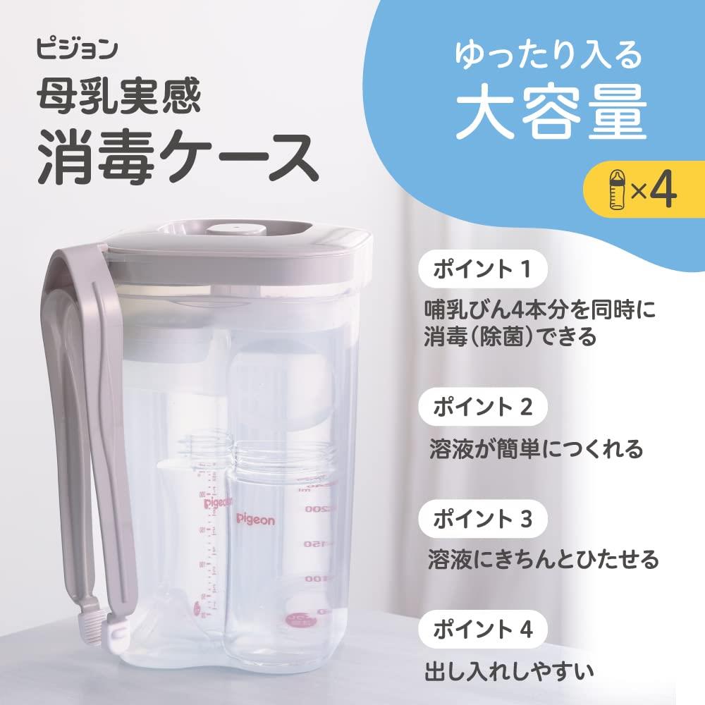 ゆったり入る大容量!母乳実感が4本まとめて消毒できる大容量タイプより使いやすくなった取り出しに便利なトング付きまとめて消毒タイプの方向け母乳実感哺乳びんにぴったりなのでスペースも薬液も無駄になりにくい!●まとめて消毒タイプの方向け。 ●母乳実感が4本まとめて消毒できる大容量タイプ。。 ●取り出しに便利なトング付き。トングもより使いやすくなりまし! 。 ●セット内容は、フタ・ストッパー・ケース・トング入り。 ●薬液にきちんとひたせるストッパー。 ●出し入れしやすいトングつき。 ●いろいろなものを消毒できます。※母乳実感哺乳びんは付属しません ●約3.6Lの溶液がつくれ、24時間使用できます。 ●母乳実感哺乳びん240mlを4本分、同時に消毒(除菌)が可能です。 ●別売の哺乳びん消毒液ミルクポンの使用により、哺乳びん・乳首を衛生的に薬液消毒できるケースです。 【消毒方法】 煮沸:× レンジ:× 薬液:〇 【哺乳びん・乳首の消毒(除菌)方法】 1. 溶液をつくる ・ピジョン 哺乳びん消毒液・除菌液の場合 (液体タイプ:45ml) フタ裏側の計量線 (45ml:内側の横線)で計量し、ケースに1杯分を入れます。 ・ピジョン 哺乳びん除菌料の場合 (顆粒タイプ:1包) ケースに1包分を入れます。 ・ケース内側の水位線(表面の質感 が異なる境目)まで水道水を入れます。 2.哺乳びん用洗剤で洗う(使用後すぐに) 3.1時間以上ひたす(ストッパーを 取り付けたフタを セットし、完全にひたす) 4.使用直前に取り出す ※溶液の臭いが気になる場合はすすいでもOK(落下に注意しながら付属のトングで取り出し、溶液をよく振り切る)(すすがなくてOK) 【母乳実感 消毒ケース専用トングの使い方】 1.取り出す(トングの片方を哺乳びんに差し込んではさむ) 2.溶液を出す(手に持ち替えて溶液を出す) 3.トング先端をすすぐ(べたつき防止のため水道水ですすぐ) ※つかみ上げる際は途中で力を緩めないでください。哺乳びんが落ちて割れる可能性があります。 ※ フタ裏側の中央の穴に、ストッパー中央部を差し込んでセットしてください。外す際はストッパー中央部の側面を押しながら取り外してください。