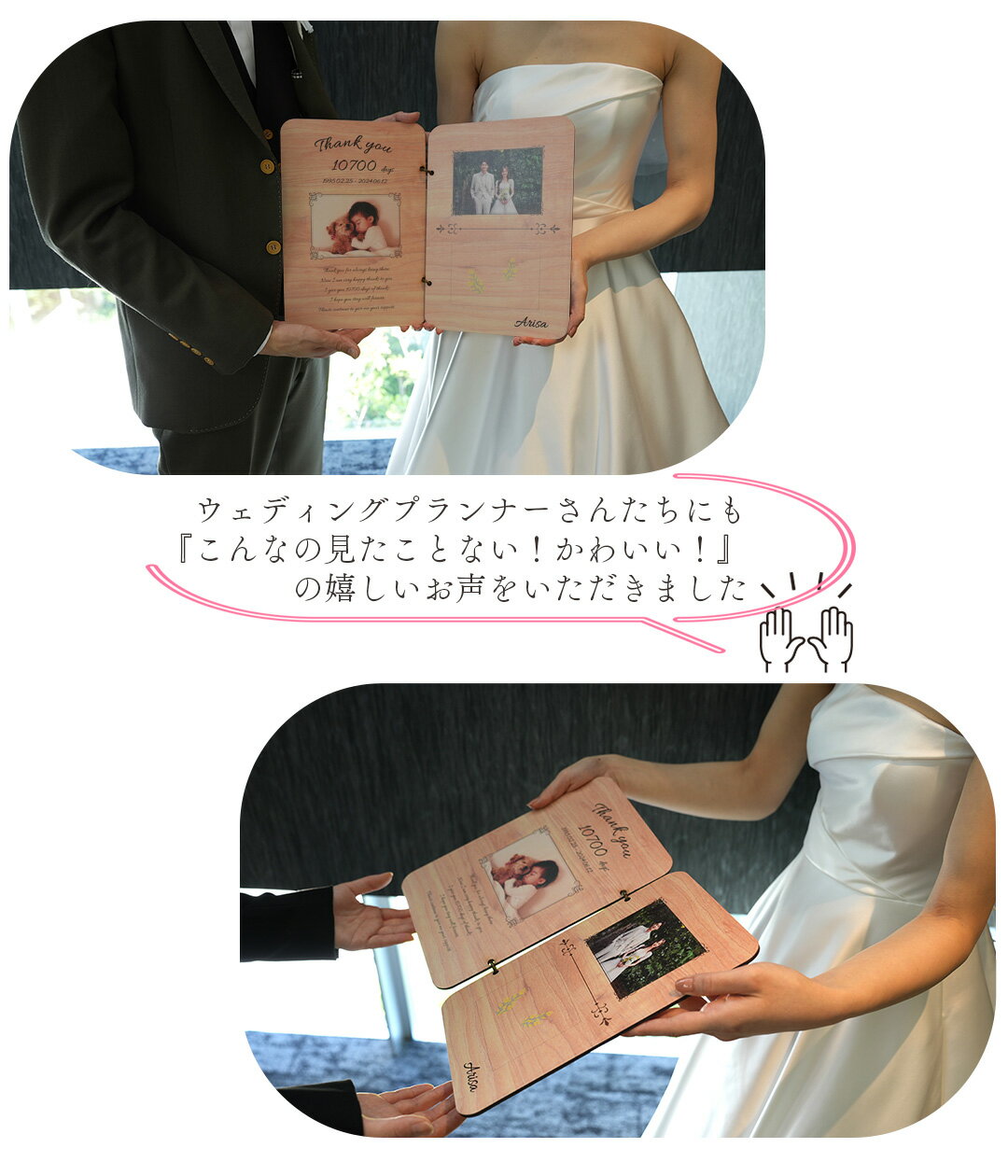 【フォト感謝状book】子育て感謝状 両親贈呈品 入籍 結婚 結婚式 両親に贈る おしゃれ 結婚準備品 プレゼント フォトフレーム 写真立て 感謝状 写真入り 家族 ギフト 父の日 母の日 ウェディング 贈呈品 両親 贈り物 お祝 データ入稿型商品 W-Board015大切な両親に。オリジナル子育て感謝状を贈りませんか? 大切な両親へ子育て感謝状です。今まで大切に育ててくれた両親に、感謝の気持ちと想い出の写真を印字して世界に一つだけのプレゼントをしませんか?「ありがとう」と「これからも」を込めてフォトスペースを作りました。結婚式当日の家族写真や、これからつくる未来。たとえ遠くに離れても、定期的に写真を送り思い出を共有していってもらいたいという願いを込めました。立てかけたり場所を選ばず飾りやすい本のように。4面すべてに印刷してあるのでどこから見ても可愛いデザインにしました。【ご注意】※プリントの文字校正・レイアウト等は当店のお任せになりますのでご了承下さい。(文章はお間違えの無いようご入力ください)一つ一つ丁寧に作成させて頂きますのでご安心ください。【ご注文から発送までの手順】1.ご注文確定後、こちらからデータ入稿のご案内メールをいたしますので、記載された方法にてデータ入稿をお願いいたします。2.いただいたデータをもとに印刷用データを作成し、楽天のメッセージに添付送信いたします。(所要日数2〜3営業日)お客様でしっかりとご確認いただき、必ず楽天メッセージでご返信ください。3.確認のメッセージをいただいてから製作に入ります。(所要日数5〜6営業日程度)お届けまで余裕を持ってご注文をお願いいたします。 5