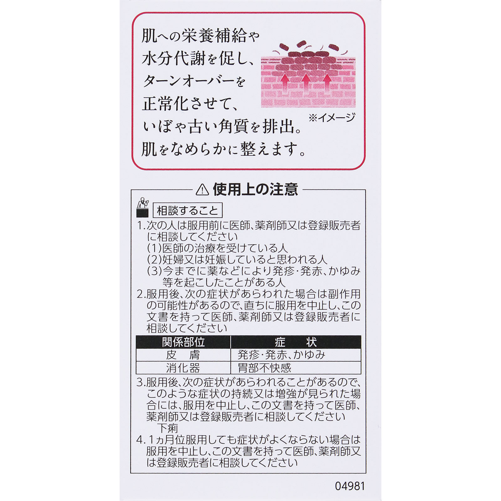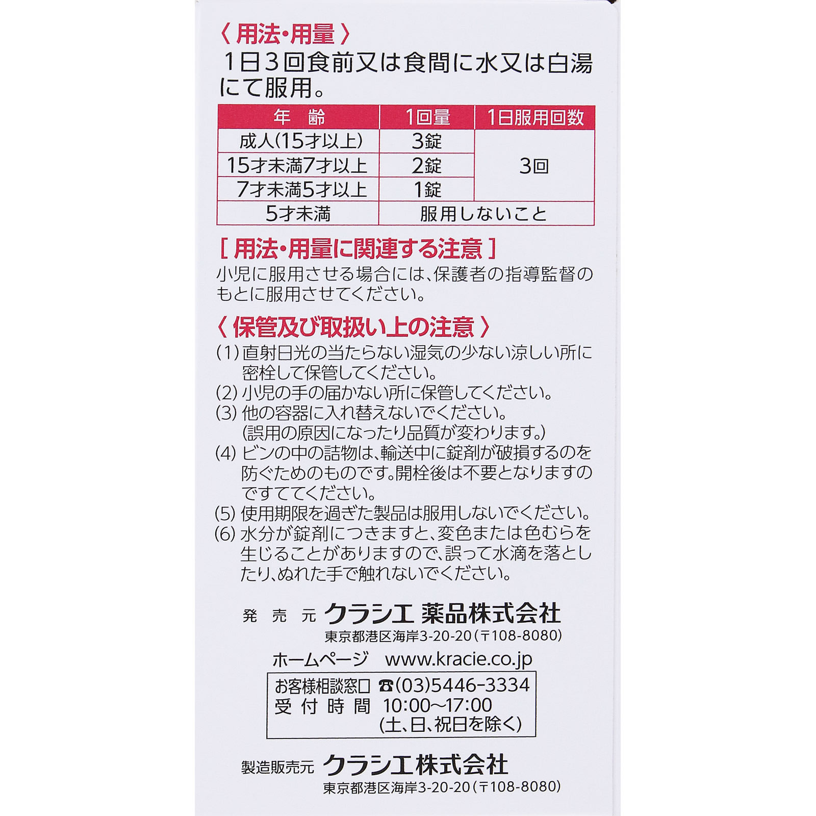 添付文書の内容商品説明文 特徴 いぼ・肌あれに悩む方へ 錠剤タイプ 生薬製剤 肌への栄養補給や水分代謝を促し、ターンオーバーを正常化させて、いぼや古い角質を排出。肌をなめらかに整えます。 使用上の注意 ■相談すること 1.次の人は服用前に医師,薬剤師又は登録販売者に相談してください (1)医師の治療を受けている人 (2)妊婦又は妊娠していると思われる人 (3)今までに薬などにより発疹・発赤,かゆみ等を起こしたことがある人 2.服用後,次の症状があらわれた場合は副作用の可能性があるので,直ちに服用を中止し,この文書を持って医師,薬剤師又は登録販売者に相談してください [関係部位:症状] 皮膚:発疹・発赤,かゆみ 消化器:胃部不快感 3.服用後,次の症状があらわれることがあるので,このような症状の持続又は増強が見られた場合には,服用を中止し,この文書を持って医師,薬剤師又は登録販売者に相談してください 下痢 4.1ヵ月位服用しても症状がよくならない場合は服用を中止し,この文書を持って医師,薬剤師又は登録販売者に相談してください 有効成分・分量 成人1日の服用量9錠(1錠220mg)中 成分・・・分量 ヨクイニンエキス(ヨクイニン20gより抽出。)・・・1000mg 添加物として、二酸化ケイ素、セルロース、クロスCMC-Na、ステアリン酸Mgを含有する。 効能・効果 いぼ、皮膚のあれ 用法・用量 1日3回食前又は食間に水又は白湯にて服用。 年齢・・・1回量・・・1日服用回数 成人(15才以上)・・・3錠・・・3回 15才未満7才以上・・・2錠・・・3回 7才未満5才以上・・・1錠・・・3回 5才未満・・・服用しない 用法関連注意 小児に服用させる場合には,保護者の指導監督のもとに服用させてください。 成分に関連する注意 本剤は天然物(ヨクイニン)のエキスを用いていますので,錠剤の色が多少異なることや,錠剤の表面に黒褐色の斑点が見られることがあります。また,ヨクイニン特有のにおいを感じることがあります。 保管及び取り扱い上の注意 (1)直射日光の当たらない湿気の少ない涼しい所に密栓して保管してください。 (2)小児の手の届かない所に保管してください。 (3)他の容器に入れ替えないでください。 (誤用の原因になったり品質が変わります。) (4)ビンの中の詰物は、輸送中に錠剤が破損するのを防ぐためのものです。開栓後は不要となりますのですててください。 (5)使用期限を過ぎた製品は服用しないでください。 (6)水分が錠剤につきますと,変色または色むらを生じることがありますので,誤って水滴を落としたり,ぬれた手で触れないでください。 製造販売元 本剤についてのお問い合わせは、お買い求めのお店あるいは下記にお願いいたします。 会社名:クラシエ薬品株式会社 問い合わせ先:お客様相談窓口 電話:(03)5446-3334 受付時間:10:00〜17:00(土,日,祝日を除く) 会社名:クラシエ株式会社 住所:〒108-8080 東京都港区海岸3-20-20 広告文責会社名:株式会社ウィーズ TEL:048-501-7440 区分:第三類医薬品 メーカー:クラシエ株式会社