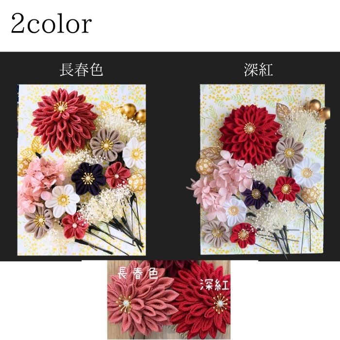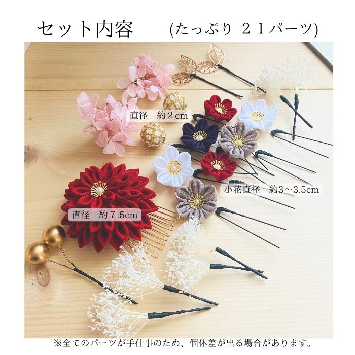 商品情報素材/材質一越ちりめんサイズ/寸法メインのお花 直径約7.5cm小花 花部分3~3.5cm和玉 2cm球、その他商品説明パーツ毎に独立したUピン、Iピン仕上げです。ヘアスタイルに合わせて飾っていただけます。浴衣やお呼ばれの際には2.3本使ったアレンジも素敵です。注意モニター発色の具合により色合いが異なる場合がございます。ちりめんは水に弱い素材です。水濡れ、保管時の湿気にはご注意くださいませ髪飾り 成人式 つまみ細工【2カラー】ピンク 赤 パール 結婚式 卒業式 振袖 袴 白無垢 色打掛 着物 伝統的 赤 白 金 和風 剣つまみ 水引 和玉 かすみ草 マム 和装 特別 撮影 フォトウエディング 深紅 白金 和婚 ヘッドドレス 【レビューキャンペーン中】こんな髪飾り探してた!花びら1枚1枚丁寧な手仕事。上質な髪飾りです。 5