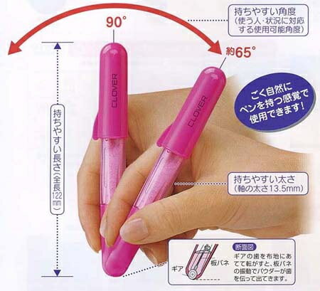 Fチャコライナーペン型(色)白、青、黄、ピンク(内容)1個入りペンで描くようにしるし付けができる新デザイン!チャコライナー(粉チャコ)がさらに使いやすくなりました。使いやすさはまさにペンタッチ!人にやさしいフィット感と機能性を追求したFシリーズです。細くてきれいなラインが描ける、ソフトな書き味でハッキリ描ける、はらい落とすだけで消すことができるなど、パウダータイプのしるし付け用品として高い評価を得ているチャコライナー(粉チャコ)に、さらに使いやすくなった新デザインの「ペン型」が加わりました。ペンを持つように使えますから、ムダな力や手の動きがなく、しるし付けが思いのままにできます。Fチャコライナーペン型の特長持ちやすい長さと太さと角度本体サイズをペンのように持つことができる長さと太さにしました。さらに持ちやすい角度で使えるように使用できる角度が広くなっています。そのため、小回りがきくようになり直線も曲線も自在に引くことができるようになりました。定規に沿ってしるしが引きやすい先端部を薄くして定規に当てやすくしましたので、先端部が見やすくなり、定規に沿ってきれいに線を引くことができます。パウダーの残量が見える商品本体をスケルトンボデイにし、パウダー残量が見えるようになっています。パウダーの補充時期がわかりやすくなりました。カートリッジ交換によって手間を省略パウダーの補充はカートリッジの交換によって簡単にできます。補充の際にパウダーが飛び散ったり、手を汚したりすることがほとんどありません。滑らかな描き味ギアのギザ歯形状、内部パーツ、パウダー成分などの見直しにより滑らかな描き味を実現しました。なお、ブルーとピンクのパウダーの色目を若干濃くして、それぞれの特徴を生かせるようにしました。●Fチャコライナーペン型カートリッジはコチラ手づくり商品は手芸の山久で手芸の山久では納品明細をメールにてお送りしています。当該商品は自社販売と在庫を共有しているため、在庫更新のタイミングにより在庫切れの場合、やむをえずキャンセルさせていただく場合もございます。ギフト用の無料ラッピング・メッセージカードをお付け出来ます。ご希望の方は備考欄に「ラッピング希望」「メッセージカード希望」とご記入いただき、メッセージカードの内容を備考欄にご記入ください。※デザインはお任せになります。クロバーはしるし付け用品を総合的に品揃えしています。