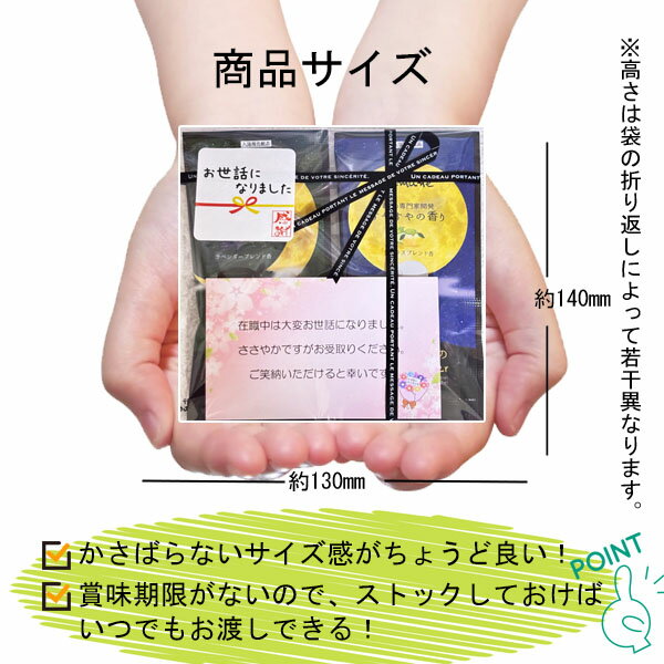 1個単位からご購入頂ける単品ページです。少量のご注文も大丈夫です♪ ご自宅用、プチギフトどちらにもおすすめの入浴剤10回分セット。今日はどれにしようかな?その日の気分でお楽しみいただけます。 香り高いコーヒーの香りが、コーヒー好きの方への贈り物に最適なコーヒーセット。 紅茶派の方への贈り物に!ホット一息つきたい時のティータイムにおすすめの紅茶ギフト。 食卓の一品プラス!お弁当のお供にも嬉しいスープギフト。 ■貰った相手も贈ったあなたも笑顔になれる!リラックスしたバスタイムを楽しめる入浴剤。 贈り物にぴったりなかわいいパッケージが人気の秘密♪お友達、職場の方、ご家族…。選べるギフトシール、ギフトカードをご用意していますので、様々なシーンでの贈り物にご利用頂けます♪ 入浴剤 ぐっすりの香りラベンダーブレンド香(湯色:ラベンダーブルー) すやすやの香りシトラスブレンド香(湯色:ムーンイエロー) セット数10人分セット 内容量20g/1P 注意事項 飲食物ではありません。お肌に合わない場合はご使用を中止して下さい。高温・多湿を避け乳幼児の手の届かない場所に保管して下さい。使用方法・使用上の注意をよく読んでご使用下さい。 \様々なシーンでの贈り物に選ばれる/季節のイベント一覧1月 正月 初詣 新年の挨拶 仕事始め 成人式 新年会2月 節分 バレンタイン バレンタインデー3月 ひな祭り ホワイトデー 卒園式 卒園 卒業式 卒業4月 入園式 入学式 入社式 進級5月 GW 子供の日 こどもの日 子どもの日 母の日6月 父の日7月 七夕 夏休み お中元 夏ギフト サマーギフト 暑中見舞い8月 夏祭り 夏まつり お盆 帰省 残暑見舞い 帰省土産 手土産9月 新学期 運動会 体育祭 敬老の日10月 ハロウィン11月 勤労感謝の日 七五三12月 クリスマス クリスマスプレゼント クリスマス会 忘年会 お歳暮 冬ギフト 仕事納め プレゼント交換 お祝いの贈り物に誕生日 内祝い 内祝 送別会 謝恩会 お別れ会 記念日 結婚記念日 出産内祝い 出産内祝 快気祝い 銀婚式 金婚式 60歳 還暦 かんれき 70歳 古希 / 古稀 こき 77歳 喜寿 きじゅ 80歳 傘寿 さんじゅ 81歳 半寿 はんじゅ 88歳 米寿 べいじゅ 90歳 卒寿 そつじゅ 99歳 白寿 はくじゅ 100歳 紀寿 きじゅ / 百寿 ひゃくじゅ 老若男女問わず贈れる お父さん お母さん お義父さん お義母さん 兄弟 兄 弟 姉妹 姉 妹 子ども 子供 孫 息子 娘 彼氏 彼女 友達 友人 仲良し 先生 女性 男性 女 男 10代 20代 30代 40代 50代 60代 70代 80代 90代 町内会や学校行事にも施設 家 町内会 保育園 幼稚園 こども園 小学校 中学校 高校 大学 スクール 塾 習い事 教室 イベント 催事 催し事 子供会 自治会 粗品 結婚式の引き出物やサンキューギフトにも結婚式 ウェディング ブライダル 挙式 新郎新婦 両親へのプレゼント 二次会 お祝い返し お車代 引き出物 引出物 フラワーシャワー お心付け テーブルコーディネート ペーパーアイテム ウェルカムアイテム ゲーム ビンゴ大会 景品 オフィスでも大活躍!店舗 店 事務所 オフィス ノベルティ 梱包 御礼 御礼品 ラッピング ご来場プレゼント ご成約記念 贈答品 挨拶 挨拶回り あいさつ回り 定年 転勤 異動 取引先 お客様 上司 先輩 後輩 部下 同僚 職場 店長 退職 退職祝い 産休 育休 関連ワードプチギフト 雑貨 実用的 お取り寄せ 引越し挨拶 感謝 ありがとうシール お世話になりました シール お世話になりましたシール メッセージシール 美容 入浴剤 バスパウダー 個別包装 個包装 お風呂 バスグッズ お試し お徳用 お得 500円 300円 以下 おやすみ前のバスパウダー ラベンダー シトラス ほんの気持ち かわいいギフト おしゃれなギフト 疲労回復 アロマ 高級感 詰め合わせ セット 温泉 気分 保湿 ちょっとした お礼 冷え性 対策 発汗