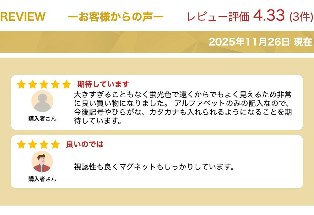 商品説明■名称:蛍光アクリル ゴルフマーカー ■マーカーサイズ:直径35×3.3mm ■クリップサイズ:約20×25×13mm ■重さ:マーカー約5.6g/クリップ約5.6g ■マーカー材質:アクリル/スチール(裏面) ■クリップ材質:鉄/マグネット ■マーカーカラー:蛍光グリーン、蛍光オレンジ、蛍光ピンク ◎クリップ側に磁石が付いておりますご注文方法●刻印する文字は注文時の備考欄に記入してください。 ※商品を複数ご購入いただく場合は各商品ごとに記入してください。 ●英数字は半角でご入力してください。 ※全角で入力された場合でも刻印は半角になります。 ●商品のレイアウト等は当店のスタッフにお任せいただきます。 注)ご指定いただいたフォント・レイアウト等はバランスによって変更させていただく場合があります。 ※記入内容に不明な点があった場合は別途ご連絡させていただきます。 ●ご要望がございましたら注文時の備考欄にご記入ください。刻印についてカラー選択【蛍光グリーン・蛍光オレンジ・蛍光ピンク】 デザイン選択【1番-50番】 ・刻印文字 上段文字【 】 例:KAZUHIRO 下段文字【 】 例:SHIRAKI ・備考【 】※名入れ欄ではありません。発送について・この商品はメール便(送料無料)での発送になります。 ※ご注文状況により、メール便以外の配送方法になる場合があります。 ・メール便は時間指定、日付指定は出来ません。 ・配達員の手渡しではなくポスト投函になります。 ・ご注文合計金額8,000円以上で【送料無料】宅配便での発送となります。注意事項・オリジナル製品は、1個づつ制作させて頂きますので、複数以上でご注文いただいた場合、同じデータでも仕上がりが異なる場合があります。 ・精密機械で製作させて頂きますが、微妙なズレや傾きなどがある場合もございます。 ・アクリル、レザー、真鍮製品・ステンレス製品・アルミ製品などの金属製品は、若干の傷や汚れなどがある場合もございます。 ・素材等の色合いは撮影位置やモニターなどの環境により色合いが異なる場合があります。 関連商品ゴルフマーカー 30mm ミラーアクリル 名入れ 2色展開 50デザイ...ゴルフマーカー 35mm アクリル系樹脂 名入れ 6色展開 50デザイ...ゴルフマーカー 35mm アクリル系樹脂 名入れ レーザー加工 レギュ...980円980円980円ゴルフマーカー 40mm 大きい Bigタイプ ミラーアクリル 名入れ...シングル グリーンフォーク ディボットツール 名入れ 刻印...遠くても見える 蛍光 ゴルフマーカー 40mm 大きいサイズ 厚み5m...980円980円740円遠くても見える 蛍光 ゴルフマーカー お洒落 ステッチ風 矢印 デザイ...遠くても見える 蛍光 ゴルフマーカー カジノチップ デザイン 40mm...遠くても見える 蛍光 ゴルフマーカー 40mm 大きいサイズ 厚み5m...690円740円740円---> 注目のゴルフマーカー商品はこちら 遠くても見える蛍光ゴルフマーカー視認性抜群!遠くからでも見える蛍光ゴルフマーカー。 紫外線に反応して鮮やかに光りだす特殊な機能を持った集光アクリルです。 太陽の紫外線に反応しますので、遠くても見やすいのが特徴です。 ホールインワン ゴルフコンペ 記念品にもお勧めです。 ◎蛍光アクリル(集光)のゴルフマーカーです。 ◎35mmマーカー、マグネット入ハットクリップ付です。 ◎上段、下段にお好みの文字を刻印出来ます。 ◎蛍光グリーン、蛍光オレンジ、蛍光ピンクの3色からお選び頂けます。 ◎50デザインよりお選び頂けます。 ◎フォントは、Segoe UI(英大文字)になります。 【掲載画像について】 実物と色合いが異なる場合があります。 予めご了承の上お買い求めくださいませ。50デザインよりお選び頂けます。【デザインリスト1】50デザインよりお選び頂けます。【デザインリスト2】1番 ゴルフクラブ 2番 スマイル 3番 スター 4番 ユニオンジャック 5番 矢印 6番 ゴルファー 7番 ゴルファー 8番 ゴルファー 9番 ボーダー 10番 サーファー 11番 スケボー 12番 ラブフラミンゴ 13番 ツインドルフィン 14番 おひつじ座 15番 おうし座 16番 ふたご座 17番 かに座 18番 しし座 19番 おとめ座 20番 てんびん座 21番 さそり座 22番 いて座 23番 やぎ座 24番 みずがめ座 25番 うお座 26番 音符 27番 十六分音符 28番 ハート 29番 クローバー 30番 四つ葉 31番 エンジェル 32番 ベアー 33番 ドルフィン 34番 ダック 35番 柴犬 36番 トイプードル 37番 チワワ 38番 ダックスフンド 39番 ゴールデンレトリバー 40番 イタリアングレーハウンド 41番 フレンチブルドッグ 42番 パグ 43番 アメリカンショートヘア 44番 ジャパニーズ 45番 トンキニーズ 46番 ジャパニーズボブテイル 47番 ロシアンブルー 48番 シャルトリュー 49番 ベンガル 50番 肉球フォント、配置、詳細について