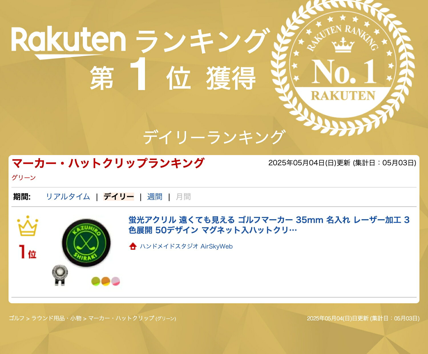 蛍光アクリル 遠くても見える ゴルフマーカー 35mm 名入れ レーザー加工 3色展開 50デザイン マグネット入ハットクリップ付 コンペ 景品 オーダーメイド