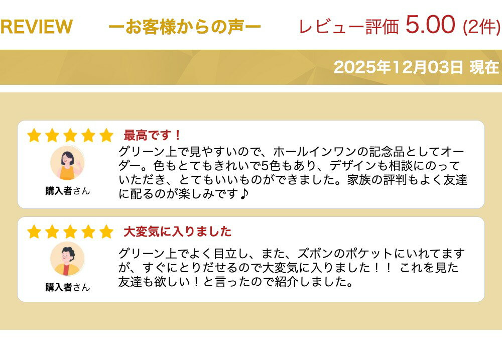 商品説明■名称:蛍光アクリル ゴルフマーカー ■マーカーサイズ:約40mm ■重さ:約7.3g ■マーカー材質:アクリル ■マーカーカラー:蛍光グリーン、蛍光オレンジ、蛍光ピンク、蛍光バイオレット、蛍光レッドご注文方法●刻印する文字は注文時の備考欄に記入してください。 ※商品を複数ご購入いただく場合は各商品ごとに記入してください。 ●英数字は半角でご入力してください。 ※全角で入力された場合でも刻印は半角になります。 ●商品のレイアウト等は当店のスタッフにお任せいただきます。 注)ご指定いただいたフォント・レイアウト等はバランスによって変更させていただく場合があります。 ※記入内容に不明な点があった場合は別途ご連絡させていただきます。 ●ご要望がございましたら注文時の備考欄にご記入ください。刻印についてカラー選択【蛍光グリーン・蛍光オレンジ・蛍光ピンク・蛍光バイオレット・蛍光レッド】 デザイン選択【1番-50番】 ・刻印文字 上段文字【 】 例:KAZUHIRO 下段文字【 】 例:SHIRAKI ・備考【 】※名入れ欄ではありません。発送について・この商品はメール便(送料無料)での発送になります。 ※ご注文状況により、メール便以外の配送方法になる場合があります。 ・メール便は時間指定、日付指定は出来ません。 ・配達員の手渡しではなくポスト投函になります。 ・ご注文合計金額8,000円以上で【送料無料】宅配便での発送となります。注意事項・オリジナル製品は、1個づつ制作させて頂きますので、複数以上でご注文いただいた場合、同じデータでも仕上がりが異なる場合があります。 ・精密機械で製作させて頂きますが、微妙なズレや傾きなどがある場合もございます。 ・アクリル、レザー、真鍮製品・ステンレス製品・アルミ製品などの金属製品は、若干の傷や汚れなどがある場合もございます。 ・素材等の色合いは撮影位置やモニターなどの環境により色合いが異なる場合があります。 関連商品【楽天1位】 遠くても見える 蛍光 ゴルフマーカー カジノチップ デザ...【楽天1位】 遠くても見える 蛍光 ゴルフマーカー 40mm 大きいサ...【楽天1位】 遠くても見える 蛍光 ゴルフマーカー ビッグイニシャル ...740円740円740円【楽天1位】 遠くても見える 蛍光 ゴルフマーカー お洒落 ステッチ風...【楽天1位】 遠くても見える 蛍光 ゴルフマーカー スター (星) デ...【楽天1位】 蛍光アクリル 遠くても見える ゴルフマーカー 35mm ...690円740円980円ゴルフマーカー 30mm ミラーアクリル 名入れ 2色展開 50デザイ...【楽天1位】 遠くても見える 蛍光 ゴルフマーカー お洒落 ゴルフボー...【楽天1位】 遠くても見える 蛍光 ゴルフマーカー ギターピック型 デ...980円740円740円---> 注目のゴルフマーカー商品はこちら 遠くても見える蛍光ゴルフマーカー遠くからでも視認性に優れた蛍光ゴルフマーカーは、ゴルフ場でのプレーをより快適にします。 蛍光グリーン、オレンジ、ピンク、バイオレット、レッドの5色展開で、個性を演出。 50種類のデザインから選べるため、好みに合わせたオーダーメイドが可能です。 名入れやレーザー加工も施せるため、コンペの景品としても最適です。 厚み5mmのしっかりとした作りで、使いやすさも抜群です。 視認性抜群!遠くからでも見える蛍光ゴルフマーカー。 紫外線に反応して鮮やかに光りだす特殊な機能を持った集光アクリルです。 太陽の紫外線に反応しますので、遠くても見やすいのが特徴です。 ホールインワン ゴルフコンペ 記念品にもお勧めです。 ◎蛍光アクリル(集光)のゴルフマーカーです。 ◎40mmのビッグサイズです。 ◎上段、下段にお好みの文字を刻印出来ます。 ◎蛍光グリーン、蛍光オレンジ、蛍光ピンク、蛍光バイオレット、蛍光レッドの5色からお選び頂けます。 【蛍光バイオレットについて】 バイオレットは、蛍光灯下では透明ですが、太陽光(紫外線)、ブラックライトに当てると変色致します。 ◎50デザインよりお選び頂けます。 ◎フォントは、Segoe UI(英大文字)になります。 【掲載画像について】 実物と色合いが異なる場合があります。 予めご了承の上お買い求めくださいませ。50デザインよりお選び頂けます。【デザインリスト1】50デザインよりお選び頂けます。【デザインリスト2】1番 ゴルフクラブ 2番 スマイル 3番 スター 4番 ユニオンジャック 5番 矢印 6番 ゴルファー 7番 ゴルファー 8番 ゴルファー 9番 ボーダー 10番 サーファー 11番 スケボー 12番 ラブフラミンゴ 13番 ツインドルフィン 14番 おひつじ座 15番 おうし座 16番 ふたご座 17番 かに座 18番 しし座 19番 おとめ座 20番 てんびん座 21番 さそり座 22番 いて座 23番 やぎ座 24番 みずがめ座 25番 うお座 26番 音符 27番 十六分音符 28番 ハート 29番 クローバー 30番 四つ葉 31番 エンジェル 32番 ベアー 33番 ドルフィン 34番 ダック 35番 柴犬 36番 トイプードル 37番 チワワ 38番 ダックスフンド 39番 ゴールデンレトリバー 40番 イタリアングレーハウンド 41番 フレンチブルドッグ 42番 パグ 43番