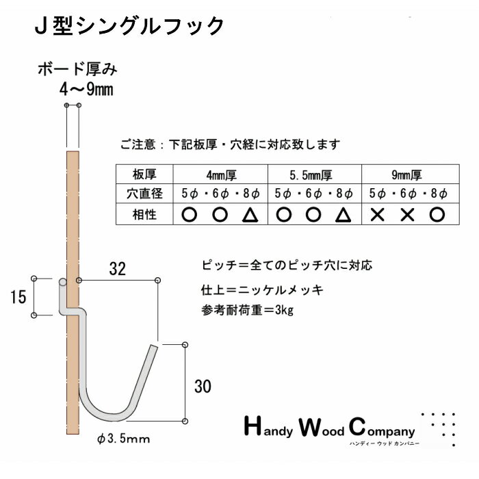 商品情報有孔ボード対応厚4mm〜9mm注:図面をご確認ください穴対応ピッチ・穴直径穴対応ピッチ:1点掛けの為全てのピッチに対応穴直径:5mm〜8mm耐荷重3kg材質鉄仕上ニッケルメッキ仕上備考〜ご購入前に必ずお読みください〜※モニター発色の具合により色合いが異なる場合がございます。※サイズには多少のばらつきがあります。※金具先端でケガをしない様十分にご注意ください。※屋外・多湿・水のかかる場所で使用しないでください。※お子様の手の届かない所にて設置、ご使用ください。※取り付け後のボード・壁・家具・引掛けたモノへの破損や傷、人体への事故、ケガ等への補償等には一切関与できません。関連キーワードペグ ペグボード PEG 孔あきボード 孔板 穴板 穴開 棚 取付 収納 インテリアラック オープンラック 棚 収納ラック 収納家具 収納棚 家庭収納 多目的ラック 丈夫な棚 丈夫なラック 整理棚 ディスプレイラック DIY オシャレ おしゃれ おすすめ 人気 安い 価格 丈夫な サイズ豊富 スリム 簡単 大容量 家庭用 掛ける ラック 掛ける 穴あきボード 壁面収納 見せる収納 壁収納 壁面ラック 有孔ボード 有効ボード フック メッシュフック ボードフック パンチングボードフック 吊り下げラック有孔ボード用 J型 シングルフック ニッケルメッキ仕上げ 10本入り 25mm 30mmピッチ 吊り下げ 壁面 棚 ディスプレイ 収納 小物掛け 金具 DIY 壁 おしゃれ インテリア アサヒ 多孔ボード 有孔 ボード フック パンチングボード 穴あき 有効ボード 25mmピッチと30mmピッチ、両方のピッチの有孔ボードフックを常備在庫しております。ハンディーウッドカンパニーの多彩な単色、多彩な木目柄の有孔ボードパネルに、多種多様な有孔ボードフックで空間演出をお楽しみください。 2