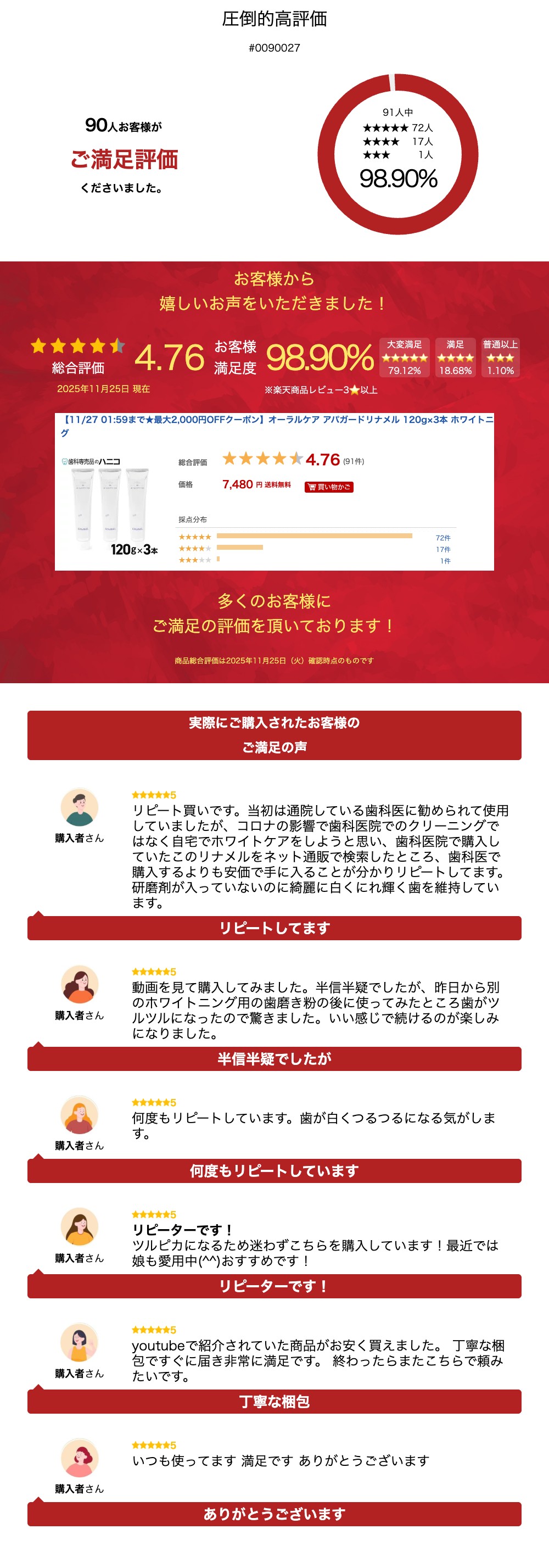 【POINT】 特長1:プラークを吸着除去 特長2:傷ついた歯の表面を修復 特長3:初期むし歯を再石灰化 内容量 120g×3本 成分 溶剤:精製水 湿潤材:濃グリセリン 薬用成分:薬用ハイドロキシアパタイト、マクロゴール400(PEG-8)、ゼオライト、ポリビニルピロリドン(PVP)、β-グリチルレチン酸、塩化セチルピリジニウム 甘味剤:キシリトール 基剤:無水ケイ酸 可溶化剤:ポリオキシエチレン硬化ヒマシ油、エタノール 発泡剤:N-ラウロイル-L-グルタミン酸ナトリウム 増粘剤:カラギ—ナン、カルボキシメチルセルロ—スナトリウム 香味剤:香料(ペパ—ミントタイプ) 安定剤:酸化チタン 保存剤:塩酸アルキルジアミノエチルグリシン フレーバー ペパ—ミント 製造国 日本 区分 医薬部外品 ▼ オーラルケア アパガードリナメル シリーズ ▼ アパガードリナメル 120g ホワイトニング アパガードリナメル 50g ホワイトニング アパガードリナメル トリートメントペースト 55g 関連商品【11/27 01:59まで★最大2,000円OFFクーポン】リペリオ...【11/27 01:59まで★P3倍+最大2,000円OFFクーポン】...7,189円7,223円【11/27 01:59まで★最大2,000円OFFクーポン】【メール...【11/27 01:59まで★最大2,000円OFFクーポン】ジーシー...3,500円6,820円【11/27 01:59まで★P3倍+最大2,000円OFFクーポン】...【11/27 01:59まで★最大2,000円OFFクーポン】ジェルコ...8,219円5,949円【11/27 01:59まで★最大2,000円OFFクーポン】ルシェロ...【11/27 01:59まで★最大2,000円OFFクーポン】ライオン...4,686円5,375円【11/27 01:59まで★P3倍+最大2,000円OFFクーポン】...【11/27 01:59まで★最大2,000円OFFクーポン】ジェルコ...4,840円11,899円