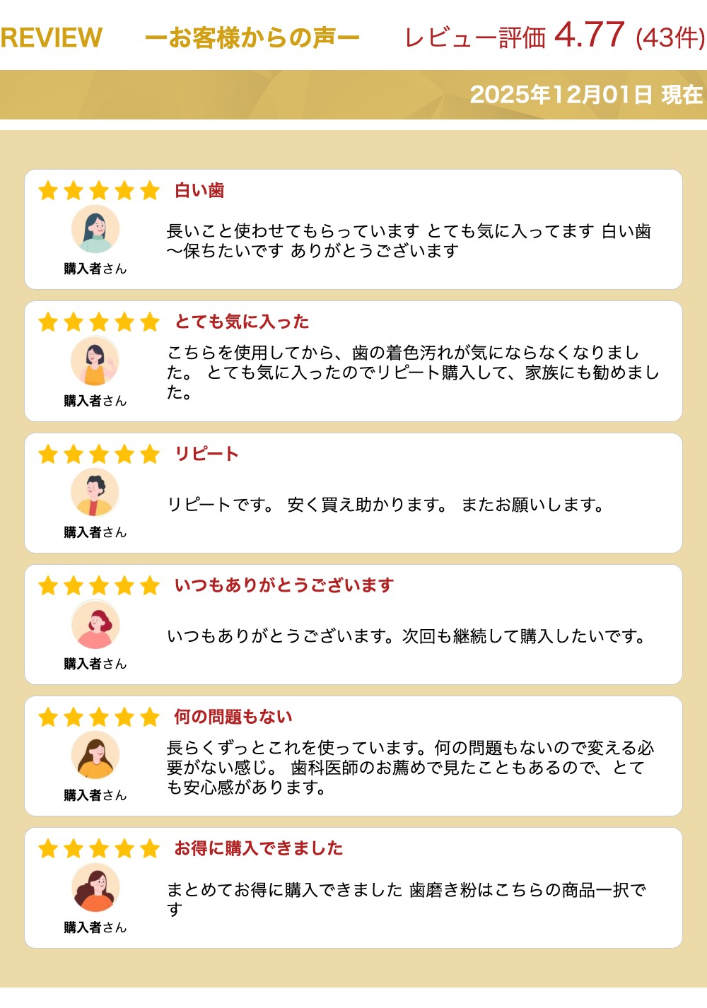 清掃助剤ピロリン酸ナトリウムとポリリン酸ナトリウムのダブル成分がイオンの力で歯の表面からステインを浮き上がらせ、 ブラッシングでステインをすっきり落とします。 新しく配合したLSS(ラウロイルサルコシンナトリウム)が、口臭原因菌を殺菌し口臭を抑えてクリアな息にも。 ステイン除去だけでなくPMTC後のステイン付着予防にもおすすめします。 入数 10本 内容量 90g 薬用成分 PEG-8、フッ化ナトリウム、ラウロイルサルコシンNa フレーバー ナチュラルペパーミント、アプリコットミント、シトラスミント 区分 医薬部外品 ブリリアントモア Wシリーズはこちら ブリリアントモア W 1本 ブリリアントモア W 3本 ブリリアントモア W 5本 関連商品リペリオ 80g × 6本 歯肉活性化歯みがき剤 歯磨き粉 歯周病予防...3M クリンプロ 歯みがきペースト F1450 ソフトミント 6本 高...7,189円7,223円ライオン システマ SP-T ジェル Plus 85g × 5本 歯磨...ライオン ブリリアントモア W 5本 (90g/本) Brillian...8,965円4,400円オーラルケア アパガードリナメル 120g×3本 ホワイトニング...ライオン DENT. システマ デンタルペーストα 10本 フッ化ナト...7,480円4,840円ルシェロ歯磨きペースト ホワイト 100g×2本 ホワイトニング...リペリオ 80g × 3本 歯肉活性化歯みがき剤 歯磨き粉 歯周病予防...3,199円3,700円ライオン DENT. チェックアップ スタンダード 1本(135g)×...ライオン システマ SP-T ジェル Plus 85g × 3本 歯磨...5,375円5,610円