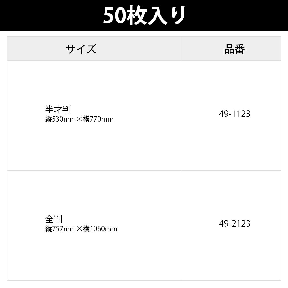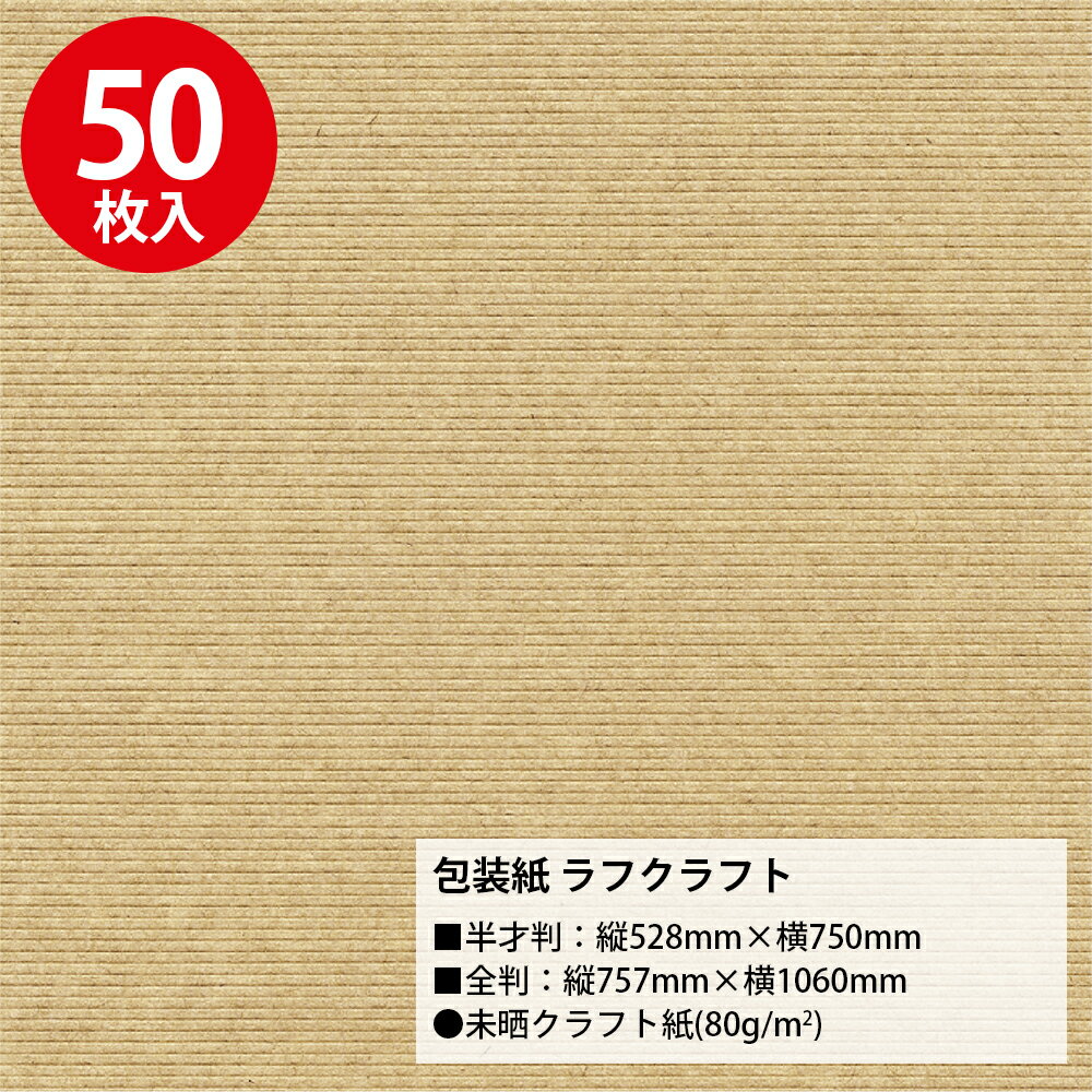 【入り数】50枚袋入 【サイズ】 半才判:縦530mm×横770mm 全判:縦757mm×横1060mm 【材質】未晒クラフト紙(80g/m2) ※紙表面に凹凸があり、ギフトシールなど、ラッピングの仕上げにシールをお貼りいただきます際、 シールの粘着により、剥がれやすい現象が見られる場合がございます。しっかり粘着のあるものをご使用ください。 包装紙 ラフクラフトとは 包装紙 ラフクラフトは、シンプルな無地柄デザインの包装紙です。ベージュの無地で、どんなギフトにも合わせやすく、贈り物を一層引き立てます。このラッピングペーパーは、誕生日、記念日、お祝い事など、特別な日のプレゼント包装に最適です。また、シンプルながらも上質なクラフト紙を使用しているため、手作りのアイテムやエコフレンドリーなギフトを好む方にも喜ばれることでしょう。紙の表面がざらりとしている未晒クラフト紙なので、ナチュラルな印象が特徴的です。サイズは縦530mm×横770mmの扱いやすい半才判サイズと、縦757mm×横1060mmの大きなギフトを包装するのに最適な全判サイズの2サイズからお選びいただけます。こちらの商品は50枚入りなので、店舗でのラッピングサービスやイベントでの大量使用におすすめです。 種類品番 半才判49-1123 全判49-2123 半才判:縦530mm×横770mm 全判:縦757mm×横1060mm包装紙の種類 包装紙には上質紙・コート紙・純白ロール紙・クラフト紙・クレープ紙・不織布など、表面がツルツルのものや裏に筋の入ったものなど種類は様々あります。紙質によっては折り目やテープが付きにくい包装紙もあるので、事前に知っておくとラッピングがスムーズにできます。包装紙の紙質を把握して、自分好みのラッピングをしましょう。こちらの包装紙は両面とも光沢がなく、ざらざらとした紙質が特徴的な未晒クラフト紙です。茶封筒などにも使われる紙質で、ナチュラルなラッピングができます。破れにくくしっかりとしていて、ナチュラルな印象があるので誕生日プレゼントからちょっとしたプチギフトまで様々な場面で活躍します。 種類大きさ品番 半才判縦530mm×横770mm49-1123 全判縦757mm×横1060mm49-2123 包装紙の選び方 用途にあったデザインを選ぶ包装紙は包む物やプレゼント内容、お誕生日などのイベントによって選ぶデザインが変わります。こちらの包装紙はシンプルな無地柄の包装紙です。どんなギフトにもなじむ定番の無地で、独特の風合いを楽しめる未晒クラフト紙はナチュラルなラッピングにぴったりです。無地なのでシーンを選ばず、プレゼントのラッピングやギフト包装にご使用いただけます。柄物のラッピングペーパーと合わせたラッピングも楽しめます。シンプルながらも洗練された印象を与えてくれるデザインなので、プレゼントを包むだけでなく、手作りのアイテムやスクラップブッキングの材料としても使用できるため、クリエイティブな活動にも最適です。自然な質感と温かみのある茶色(クラフト)が、どんなギフトにもぴったりのナチュラルな印象を与えます。用途にあったサイズを選ぶ包みたいギフトの形やサイズによって選ぶ包装紙の大きさも異なります。また、キャラメル包みや斜め包みなどの包み方の違いでも必要な包装紙のサイズは変わります。まずは箱の大きさを確認し、必要な包装紙の目安を算出してください。また、化粧折りを行う場合は化粧折り分も合わせて算出します。化粧折りとは、はじめに包装紙の片端を1回折る事で仕上がりを綺麗に見せる方法です。紙の断面が処理されているので、開封時に指を切る危険性も減ります。化粧折りをしなくてもラッピングはできますが、ちょっとした心遣いとして覚えておくと良いでしょう。 包装紙を使用するシーン シンプルな無地柄は男女ともに好まれるデザインなので、様々なシーンのギフト包装に最適です。特に、お誕生日プレゼントや還暦などの長寿祝い、母の日・父の日などの家族へのプレゼント、ホワイトデーなどのちょっとしたギフトにもおすすめです。 包装紙の保管方法 包装紙は三つ折りにして袋に入れてお届けいたします。袋入りなので、保管にも便利です。保管の際は、高温多湿と直射日光を避けてください。また、平らな場所に置くことで、シワになることを防げます。手触りの良い包装紙を良好な状態で保管することで、長期間お楽しみいただけます。