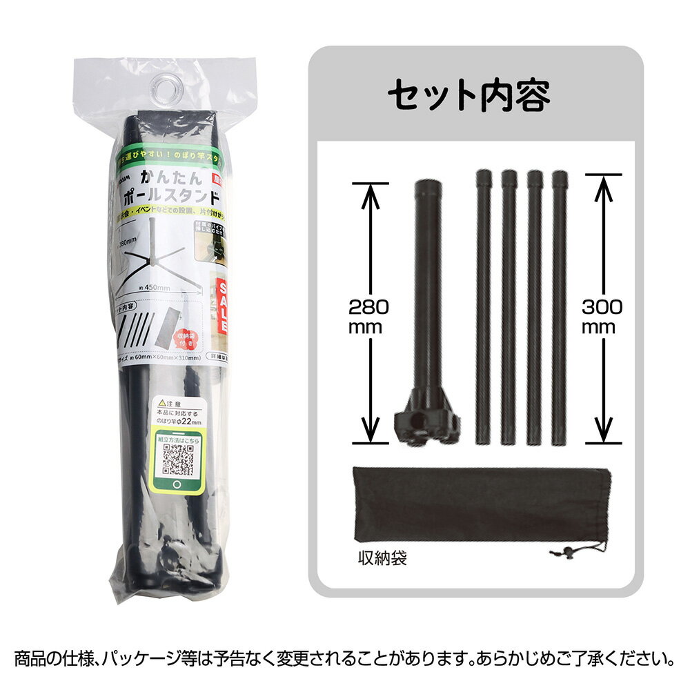 【入り数】1セット袋入 【サイズ】個装サイズ-高さ380mm×幅130mm×奥行60mm、設置サイズ-高さ280mm×幅620mmmm 【材質】スチールパイプ樹脂コーティング、 ABS、 ポリエチレン屋内のイベント展示会で、のぼり竿の設置にご使用いただけます「ポール台」です。コンパクトに収納ができ、付属の収納袋に5つの部品すべてが収まります。工具なしで組み立て可能なので、イベント会場での設営におすすめです。搬入搬出時にかさばりません!設置の際には、付属のパイプを穴に差し込むだけととっても簡単です。通常タイプののぼりポール(パイプ径φ19/22mm)が設置可能です(※キャップ部分φ25mm以下)。脚パイプを取り外せば壁面にも設置可能となります。お色は、万能な黒色(ブラック)です。●個装重量:350g