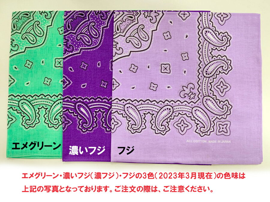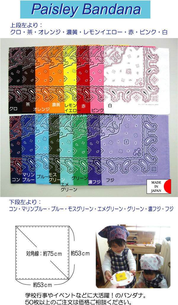 バンダナの定番柄、ペイズリーバンダナ。カラー展開がなんと16色! いろんな色から選べるのがうれしいですね。 三角巾としてお子様の頭に巻いてもかわいいです! ファッションのアクセントにも! 手首に巻いたり、バッグに結んだり、自分流に使いこなしてください! 一度のご注文で50枚以上の場合は価格ご相談ください。 ×カラー:ブルーが完売致しました。再入荷の予定は未定でございます(2025年6月26日更新) サイズ 53cm×53cm ※参考※三角巾用途なら対角線で約75cmあります 材質 綿100%日本製 色 クロ/茶/濃黄/赤/ピンク/白/コン/マリンブルー/モスグリーン/エメグリーン/グリーン/濃フジ/フジ ※在庫なし→ブルー、オレンジ その他 ハンカチーフのメーカーが丁寧に作った国内生産品です。 画面上と実物では多少色具合が異なって見える場合もございます。ご了承ください。 商品は当店実会社でも販売しております。在庫数の更新は随時行っておりますが、お買い上げいただいた商品が、品切れになってしまうこともございます。 その場合、お客様には必ず連絡をいたしますが、万が一入荷予定がない場合は、 キャンセルさせていただく場合もございますことをあらかじめご了承ください。 ☆☆☆ラッピングについてはこちらをご覧ください☆☆☆ ●無料半透明手提げ袋は輸送中の折り・汚損防止の為、商品を入れずに別添えでお送りとなります ●無料白紙袋は複数種類がある場合、男性・女性の区別はわかるように致しますが、色柄の区別をつけることはできませんのでご了承ください。(明かりに透かして見れば多少の違いは検討つくかと思います) ●ラッピング指定ボタンにないご要望がございましたら 注文画面3「お支払方法、配送方法選択」ページ一番下「その他配送についてご希望がある場合は…」の欄にお願いします。できる限り対応させていただきます。×カラー:ブルーが完売致しました。再入荷の予定は未定でございます(2025年6月26日更新)