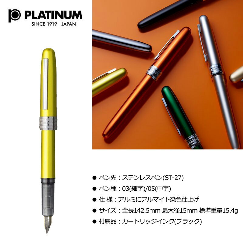 【PLATINUM】プラチナ プレジール 万年筆 PGB-1000/PGB-1000B 特徴 ボリュームのある柔らかいフォルムの金属ボディは擦り傷に強い加工を施し、長く綺麗なままお使い頂けます。 ピカピカに磨かれたステンレス製で摩耗に強い特殊合金ポイント付きのペン先は、万年筆の書き味を手軽に楽しめます。 さらにキャップを閉めた状態で、1年間使わなくてもインクが乾かない「スリップシール機構」を搭載。いつでもさらりと書き出せます。 ボデイカラーも豊富なので気分で使い分けても楽しい万年筆です。 耐久性のある万年筆本体と繰り返し使えるカートリッジ式で末長く使え、愛着の湧く手放せない一本になります。 スペック 【サイズ】全長142.5mm 最大径15mm 標準重量15.4g 【機構】カートリッジ式 【素材】アルミにアルマイト染色仕上げ 【ペン先】ステンレスペン 【ペン種】03(細字)/05(中字) カラー #1 ブラック #21 ピンク #25 ノバオレンジ #28 バイオレット #41 グリーン #56 ブルー #70 レッド 配送に関して メール便にて出荷を行います。 注意点 ※商品の色は、実際の色とは若干異なる場合がございます。 サプライ・パーツ・部品 【PLATINUM】万年筆用インキカートリッジ 10本入 【PLATINUM】万年筆用コンバーター500 【PLATINUM】万年筆用コンバーター700 【PLATINUM】クラシックインク万年筆用水性染料インク 【PLATINUM】ミクサブルインク万年筆用 水性染料インク全9カラー
