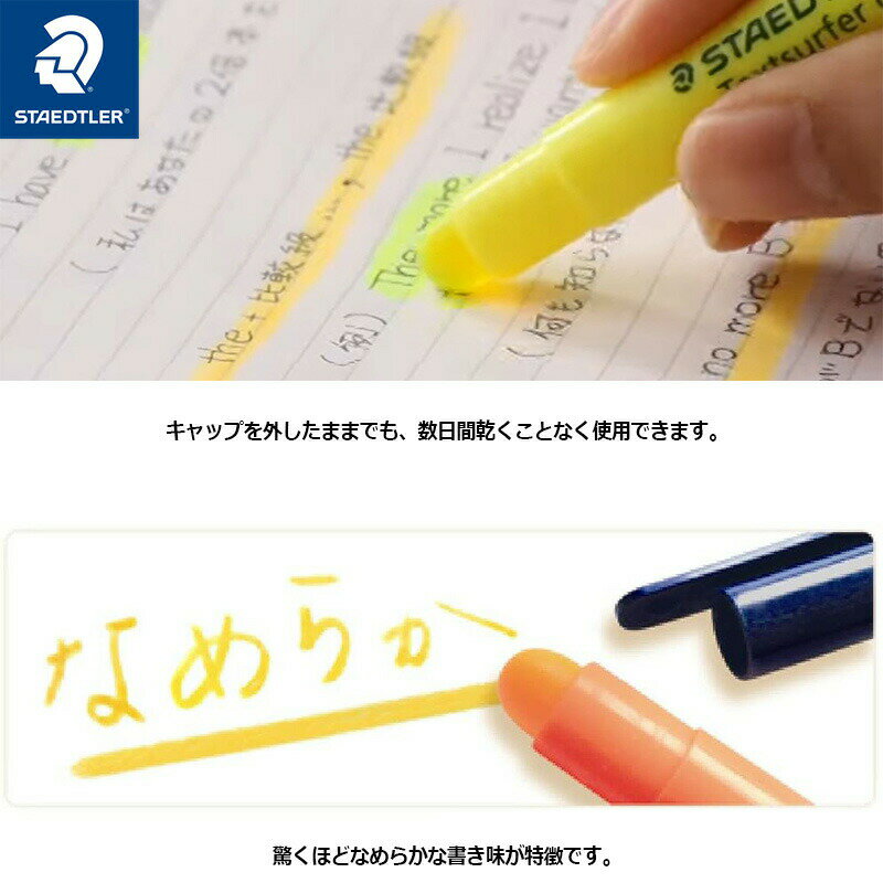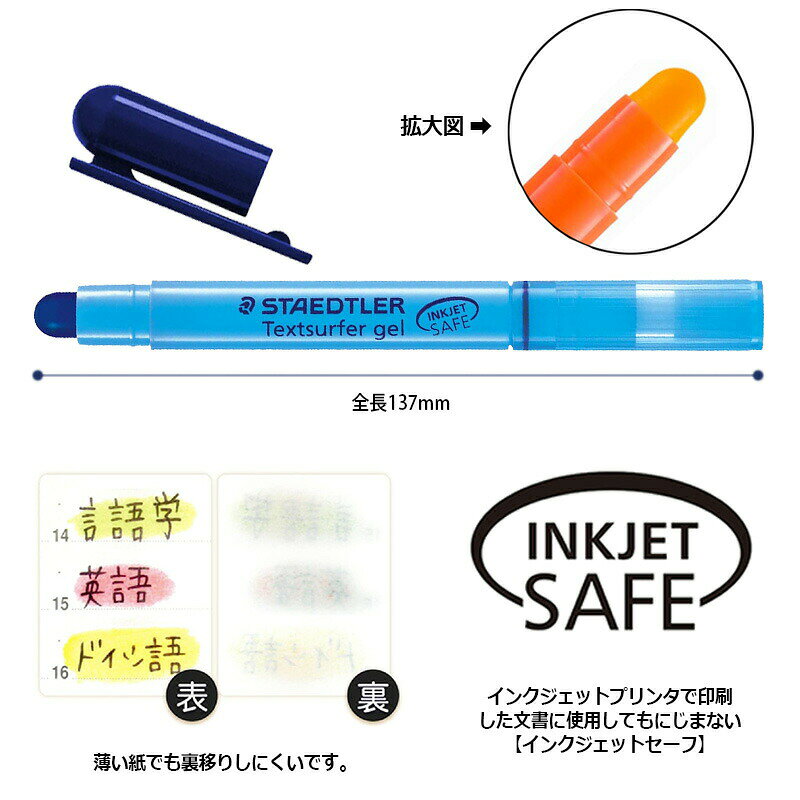 【STAEDTLER】ステッドラー 264-S PB5 テキストサーファーゲル カラーペン 5色セット 特徴 発売以来大人気の固形の蛍光マーカー。発色が良く、なめらかな書き味が特徴の商品です。薄い紙でも裏抜けせず、キャップを外したままでも2,3日は乾くことなく使用できます。これまでにない新触感の書き味が人気です。 スペック ●仕様:繰り出し式 ●5色セット: イエロー、 ピンク、 ブルー、 オレンジ、 グリーン ●本体サイズ:65×140×18mm ●本体重量:76.9g 品番 264-S PB5 配送に関して メール便にて出荷を行います。 注意点 ※商品の色は、実際の色とは若干異なる場合がございます。