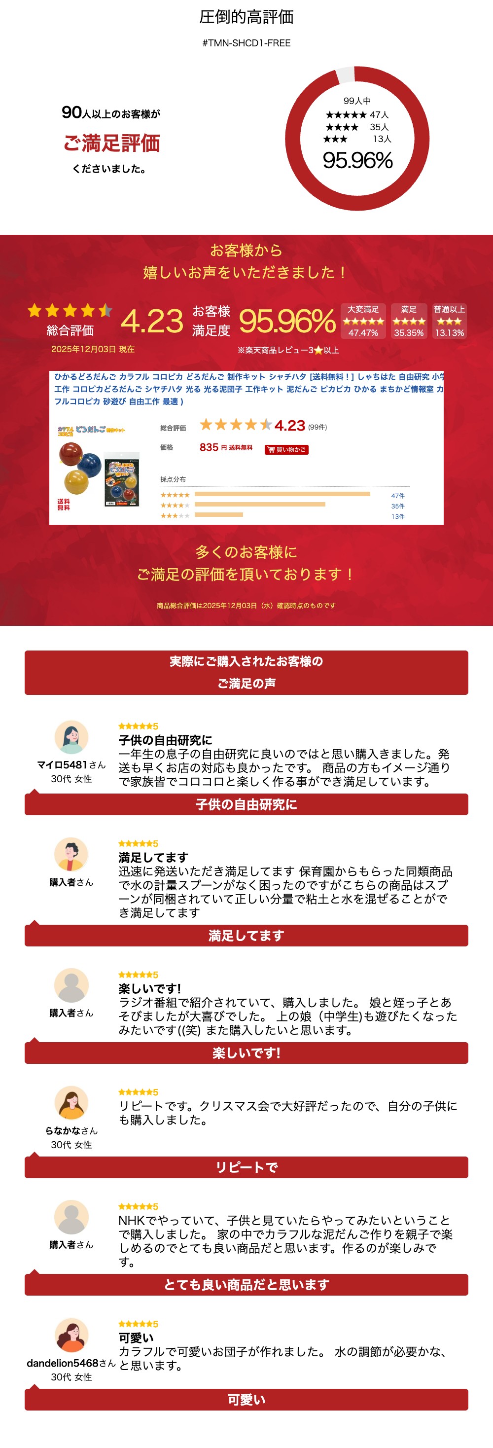 ↓↓↓工作ならこちらもおすすめ↓↓↓ はさみものりも不要!シャチハタ・ダンボール工作キット関連商品ダンボール工作キット 飛行機 段ボール 工作キット シャチハタ 100...ひかるどろだんご コロピカ どろだんご 制作キット シャチハタ[送料無...オルゴール工作キット 木工工作キット キット 工作キット | [本州送...ひかるどろだんご ラメ入り コロピカ どろだんご 制作キット シャチハ...印鑑 はんこ ジョインティJ9 10ミリ キャップレス ネーム印 Jo...1,100円605円1,000円798円870円送料無料 ゴルフマスターマーカー アートライン シャチハタ( ゴルフボ...折曲厳禁 折り曲げ厳禁 スタンプ サンビー クイックスタンパー 浸透印...木工工作キット 輪ゴムピストル TYPE5 小型単発式モデル 鉄砲 簡...インボイス スタンプ シャチハタ 別注品 5×29mm角 ゴム印 登録...シャチハタ ネーム9専用着せ替えパーツ 創業95周年記念カラー ホルダ...799円848円500円898円880円【メール便送料無料!】カラフル コロピカ どろだんご 制作キット シャチハタ 特徴 自然の砂と粘土を使った、転がすほどピカピカに輝くだんごが作れる、 コロピカどろだんご制作キットがカラフルになって、さらに楽しくなりました! 衛生的に自分だけのオリジナルどろだんごが作れるので、 夏休みの自由工作、自由研究などにもぴったりのセットです。 ※直径約57ミリなら1個、直径約47ミリなら2個、直径約37ミリなら4個のどろだんごが作れます。 (色こなは、どろだんご1個につき1種類のみ使うことができます。) セット内容 ・芯用土(約200g)・さらこな(約40g)・軽量スプーン(約10cc) ・台紙(中面が作り方の説明になっています) ・色こな(赤色・黄色・青色、各約10gずつ)原産国:日本 発送 当店在庫品ですので、即日もしくは翌営業日の発送となります。 送料無料(メール便限定)です。