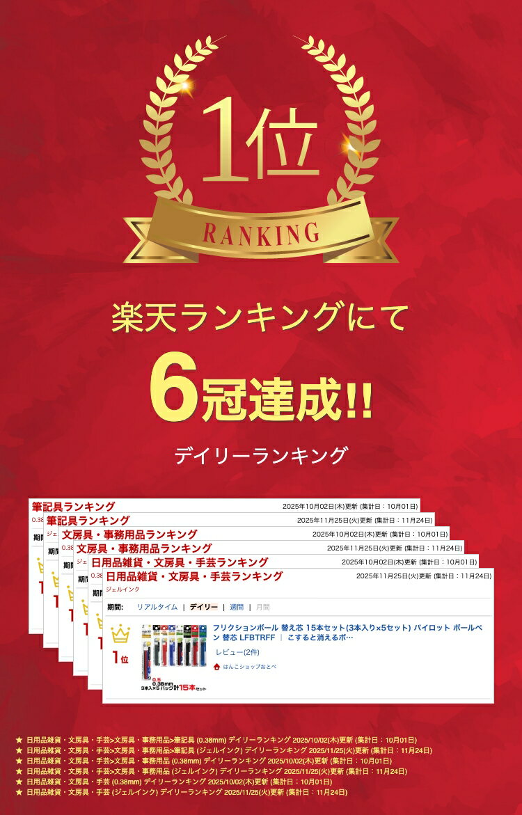 関連商品替芯 BRFN-30 パイロット [5本セット] 油性ボールペン 黒 ...[2本入×5パック] パイロット フリクション 替芯 LFTRF40 ...パイロット ボールペン 替え芯 BRFS 単色10本セット| PILO...パイロット ボールペン 替え芯 BVRF 10本セット 単色 | PI...パイロット ボールペン 替え芯 BVRF 黒6本+赤2本+青1本+緑1...1,650円1,990円1,180円1,080円1,080円フリクションボール 替芯 3本入り パイロット ボールペン 替え芯 L...[0.5mm] パイロット 替え芯 BVRF-8EF 黒2本+赤1本+...[0.7mm] パイロット 替え芯 BVRF-8F 黒2本+赤1本+青...[0.3mm] パイロット 替え芯 BVRF-8MF 黒2本+赤1本+...パイロット フリクション 替芯 LFTRF40 2本入りパック 0.3...330円399円399円399円440円フリクションボール 替え芯 3本入り×5セット・計15本 パイロット LFBTRFF 特徴 フリクションボール替え芯、LFBTRF(3本入り)×5セット・計15本のセット販売ページです。多色、スリム用の替え芯です。ご希望の太さ、インキ色をお求めください。 ※LFBTRFシリーズのペンであれば、どの太さの芯でも交換することが可能です。 (例)0.38mmのペンに0.5mmの芯が使えます。 仕様 ●インキ/こすると消えるフリクションインキ●品番/LFBTRF30UF(0.38mm)、LFBTRF30EF(0.5mm)●適合/【多色用】フリクションボール4・3・2(ビズ、メタル、ウッド、スリムなど)、【スリム用】フリクションボールスリム●替え芯サイズ/0.38mm・0.5mm●カラー/黒・赤・青※5セット・計15本●サイズ/全長:87.5mm・φ3.6mm 発送 ◆1〜2日以内に発送(出荷)いたします(土日祝・当店休業日は除く) メール便、定型外郵便対応商品です。