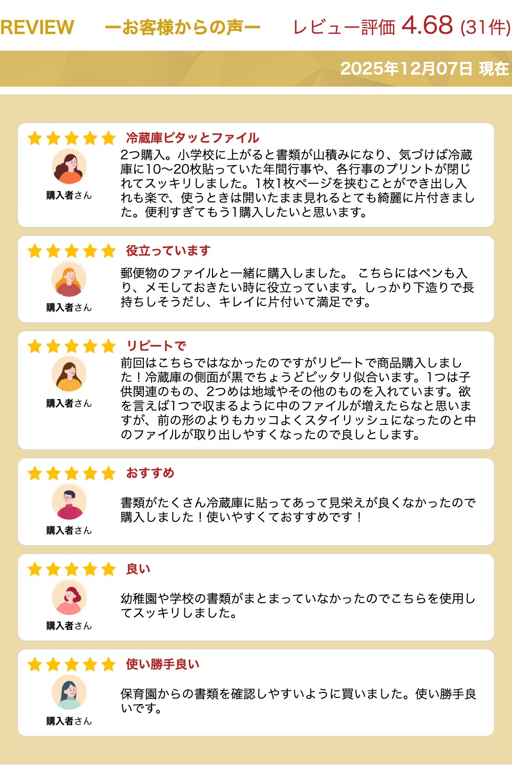 関連商品キングジム サクッと整理 ドキュメントファイル [フタ付タイプ] 22...キングジム サクッと整理 ドキュメントファイル [オープンタイプ] 2...冷蔵庫ピタッとファイル [郵便物整理タイプ] スキットマン 2951 ...冷蔵庫ピタッとファイル [見開きポケットタイプ] スキットマン 292...[2個セット] キングジム レシート 領収書 スキャンホルダー 家計簿...1,699円1,380円1,257円1,270円1,280円冷蔵庫ピタッとファイル [小物整理タイプ] スキットマン 2941 ピ...キングジム レシート 領収書 スキャンホルダー 家計簿 スキャン 懸賞...キングジム ポケットリフィル 3穴 キングミニ 3弾 ファブラブ マチ...キングジム ポケットリフィル 3穴 キングミニ 2弾 ファブラブ [1...キングジム ミニカラーベース クリアーファイル キングミニ 3弾 [全...1,036円880円583円617円840円【送料無料!】冷蔵庫ピタッとファイル [書類整理タイプ] スキットマン [送料無料] キングジム KING JIM ヨコ入れ A4サイズ A3サイズ 特徴 【送料無料!】 散らかりがちな書類を冷蔵庫にピタッとスッキリ収納! キングジムの「冷蔵庫ピタッとファイル(書類整理タイプ)スキットマン」です。 マグネット付きで冷蔵庫や金属面に簡単に固定できる便利な整理アイテムです。 学校や職場からのお知らせ、レシート、請求書、クーポン券など、 散らかりやすい紙類を分類して保管でき、日常生活の効率をアップします。 省スペース設計で冷蔵庫の外観を損なわず、どなたでも使いやすいデザイン。 ファイルのポケットがしっかりと書類をホールドし、中身がずれ落ちる心配もありません。 家庭だけでなく、オフィスや店舗での使用にもぴったり。 整理整頓をもっと簡単でスタイリッシュにしてくれる頼れるアイテムです! 仕様 ●品番:白:2931-W・黒:2931-BK ●外形寸法: [折り畳み時]約320(H)×262(W)×20(D)mm(マグネットを含む) [見開き時]約320(H)×517(W)mm ●材質:PP(本体)、マグネット ●マグネット耐荷重:110gまで(ファイル本体含まず) ●最大収納枚数: ポケット1→A4書類 約20枚 ポケット2→A5書類 約5枚 ポケット3→A4書類 約8枚またはA3書類 約3枚+A4書類 約2枚 (ポケット全体の枚数) ポケット4→A4書類 1枚 ●本体カラー:白、黒 ※大きすぎるため、ラッピングサービス対象外商品となります。 発送 ◆当店在庫品ですので、即日〜翌営業日に発送いたします。 ◆送料無料(メール便限定)です。