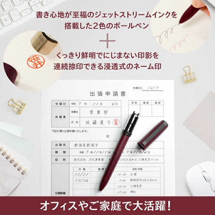 商品詳細 商品名 クイックネームペン2+1 仕様 2色ボールペン+ネーム印 ※リフィルは三菱鉛筆SXR-80シリーズをご利用ください サイズ ボールペン:H134 × W15.2 × D13.5mm ネーム印:印面9mm 材質 ABS樹脂・真鍮 インクカラー ボールペン:黒・赤 ネーム印:朱色 彫刻文字 6文字以内 / 縦書きのみ ※漢字 / ひらがな / カタカナ 注意事項 こちらの商品はメーカー直送のため、他の商品と同梱できません。他商品と購入された場合は別々の発送となります。 「書体確認(有料)」「アタリオプション」「名入れオプション」のご利用は不可商品となります。 メーカー都合(メーカーの営業時間、在庫状況)により、 発送までに日数を要する場合がございます。 配送方法は追跡番号のない「日本郵便 定形外郵便」となります。
