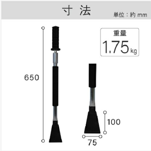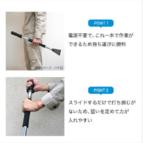 スライドするだけで簡単ハツリ作業持ち運びも楽で、しかも安全!! 実際に使用していただきました! 【用途】 ●コンクリートやアスファルトの斫り作業 【特徴】 ●先端硬度HRC40程度でアスファルトやコンクリートも斫れる。 ●狭い場所でも使えるショートタイプ。 ●ハンマーを使わないので打ち損じがなくケガのリスクを軽減 ●電動工具と比較して、軽量・携帯性に優れる。 ●手工具なので繊細な作業に最適。 【仕様】 ●サイズ 全長:650mm 頭部先端:75mm 頭部高さ:100mm 頭部板厚:6mm ●重量:1.75kg ●材質 頭部:スチール 柄部:スチール シャフト側グリップ:TPR パイプ側グリップ:NBR ●カラー:ユニクロメッキ+ブラック ●製造国:ベトナム