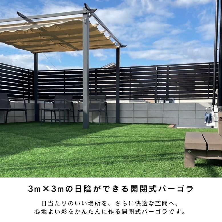 ■商品名 【ロープ開閉式】 シェード付パーゴラ ■サイズ 外寸:約 横幅296×奥行296×高さ226cm 支柱:約 9cm角 アルミの厚さ:約0.1cm ■梱包サイズ 約 横幅287×奥行21×高さ20cm【260サイズ】 ■重量 24.5kg ■材質 支柱・横梁:アルミニウム シェード用パイプ:スチール 生地:ポリエステル(PAコーティング) ■カラ— 本体:グレー 布地:ベージュ ■付属品 スパナ・ペグ ■形式 組立式 ※必ず大人2人以上で組み立ててください。 ※電動工具のご使用を推奨いたします。 ■注意 ※日よけ用商品です。雨よけにはご使用いただけません。 ※雨風による破損・倒壊の恐れがあるため、ご使用後は必ずシェードを閉じてください。 ※落下の恐れがあるため、2階以上では使用しないでください。 ※接地面の種類に合わせた方法で、設置場所にしっかりと固定してご使用下さい。 ※火気のそばや高温になる場所では使用しないでください。 ※布地は防水・撥水処理は行われておりません。 ■納期 ご注文のタイミングにより在庫欠品中の場合がございます。 在庫欠品時は次回入荷予定日を確認の上、ご連絡させていただきます。 その上でお待ちいただく、もしくはキャンセルのどちらかをご選択下さいませ。 ■商品特徴 夏の暑さ、ベランダの照り返しを抑え、快適に!お庭やガーデンスペースにマッチするパーゴラです。 お庭でのBBQやお子様のプール遊び、ペットとの時間などにもオススメです。 グランピング施設やリゾートホテル、カフェなどの法人様にもご好評頂いております。 快適な日陰スペースを作って、アウトドアライフを楽しみませんか?