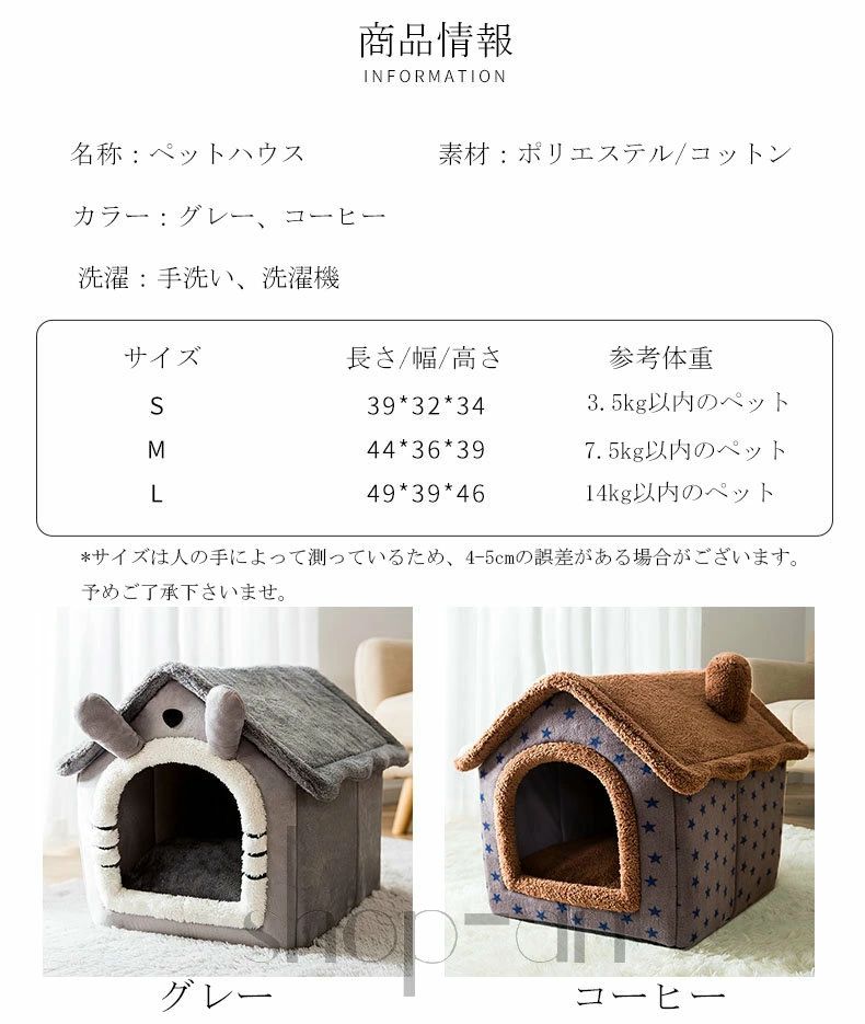 Information 商品情報 商品番号 :C3-pet74 ワンちゃんやネコちゃんにおすすめの通年タイプのベッドです。 秋冬の寒さ対策はもちろん夏場のエアコンの冷え対策にも大活躍! 季節を問わずオールシーズンお使いいただけます。 素材:ポリエステル/コットン カラー:グレー、コーヒー、グリーン、ピンク、イエロー、グレー兎、ブラウン サイズ: S(39*32*34cm)(3.5kgのペットが適応可能です) 値段:4690円 M(44*36*39cm)(7.5kgのペットが適応可能です)値段:5270円 L(49*39*46cm)(14kgのペットが適応可能です) 値段:6390円 注意:サイズにより価格が違います。ご注文後、当店にて上記表示価格に修正しメールさせていただきます。 生産国:チャイナ ※注意事項 商品写真はできる限り実物の色に近づけるよう加工しておりますが、お客様のお使いのモニター設定、お部屋の照明等により実際の商品と色味が異なる場合がございます。 こちら未開封品に限り返品可能となります。(返送時送料はお客様にご負担頂いております) 予めご了承くださいますようお願い致します。 ※到着時から箱が破損していた、商品破損があり梱包にも異常があった場合、発送中の破損事故となります、受け取り拒否をお願いいたします! ※【追加料金はシステムの仕様上、ご注文時に反映されません】オプション料金/北海道・沖縄・離島への別途送料にご注意ください。 ※サイズは平置き手採寸サイズとなりますので測り方により誤差が出る場合がございます。 3-5cmの誤差が生じている場合がございますが、不良対象となりませんのでご了承ください。 配送方法 宅急便