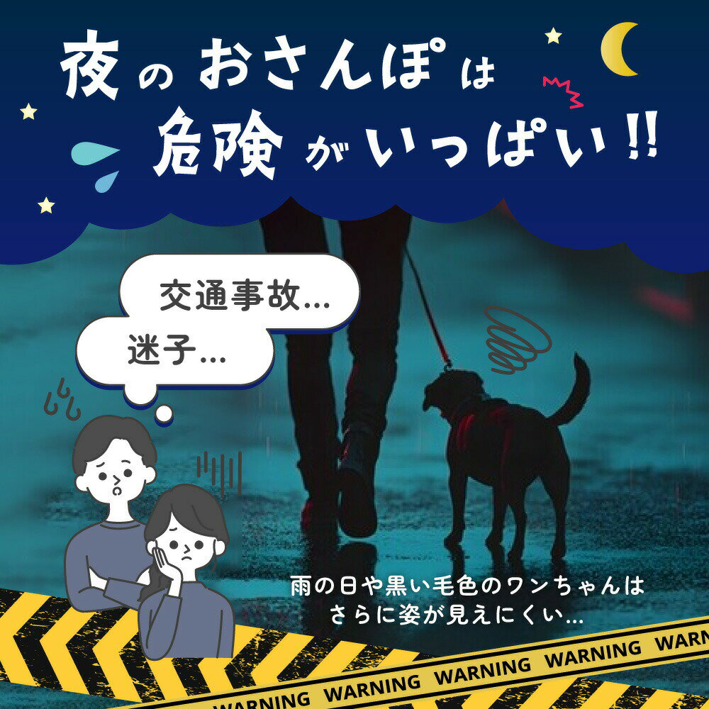 メーカー希望小売価格はメーカーカタログに基づいて掲載しています 商品情報 名称 光る レインボーリード 金具サイズ S、M リード長さ 120cm、150cm リード幅 2.5cm 重量 (金具S 120cm) 184g (金具S 150cm) 204g (金具M 120cm) 219g (金具M 150cm) 229g 耐荷重 70kg 素材 ラバー 充電時間 約1時間 連続使用時間 約10時間 製造国 中国 ※使用上の注意 ・水中での使用はご遠慮ください。 ・アダプターは付属しておりません。 ・目的以外に使用しないでください。 ・海外製品の為、予告なくデザインが変更になる場合がございます。光る レインボーリード 夜のお散歩がもっと安全で楽しくなるこのリードは、暗い夜道でも愛犬の存在をしっかりアピール。 まるでパレードのように可愛らしく光るデザインと実用性が備わった、飼い主さんとワンちゃんのためお散歩アイテムです。 ----------------------------------------- ・高い視認性で安全を確保 ・耐荷重70kgのラバー製 ・夜間や早朝のお散歩に ・アウトドアやキャンプなど灯りの少ない場所で ・USB充電で電池不要だから経済的 ----------------------------------------- ●夜のお散歩は危険がいっぱい… 交通事故や迷子、特に雨の日や黒い毛色のワンちゃんはさらに姿が見えにくい… ↓↓ こんな危険を未然に防ぐために、光るレインボーリードを付けてお散歩しよう! ●光るレインボーリードがあるとこんなに違う (ない時) ・暗くて見えにくい ・安全性の低下 (ある時) ・遠くから見えやすい ・安心感がある ●12種類の点灯パターン レインボー(高速点灯/低速点滅/切替点滅) レッド(流れ点滅/常時点灯) ブルー(流れ点滅/常時点灯) グリーン(流れ点滅/常時点灯) ピンク(流れ点滅/常時点灯) 4色切替(流れ点滅) ●持ち手のボタンで簡単切替 電源 ON/OFF : 長押し モード切替 : 短押し ●耐荷重70kg ●USB充電で何度でも使える 充電時間:約1時間 使用時間:約10時間 ※電源アダプタは付属しておりません