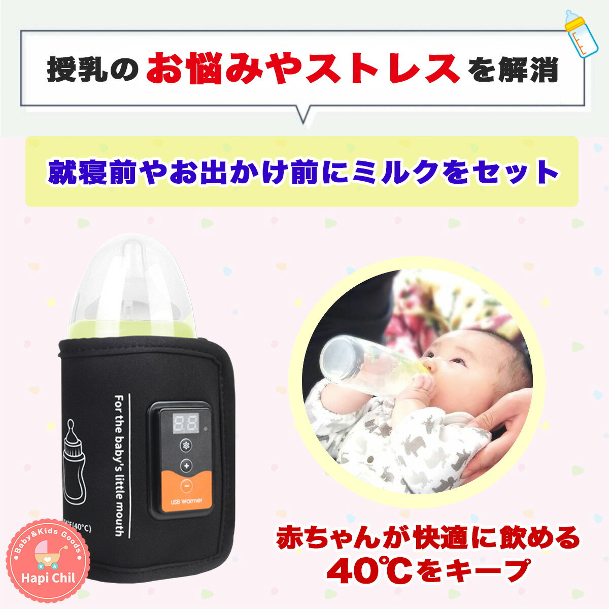 対象年齢乳児 0ヶ月、1ヶ月、2ヶ月、3ヶ月、4ヶ月、5ヶ月、6ヶ月、7ヶ月、8ヶ月、9ヶ月、10ヶ月、11ヶ月 1歳~2歳まで(1才~2才) ・男の子、女の子使用シーン※本商品は哺乳瓶ミルクの保温を目的として作られています。 常温からの温め、缶や紙パックは対象外となるのでご注意ください。 ・毎日の授乳 ・お出かけやドライブ、外出に ・夜中や就寝時 ・子どもが寝てしまった時 ※ミルク以外に飲み物の保温にも使えます ・お祝い、出産祝い、誕生日、バースデー ・ギフト、プチギフト、プレゼント製品仕様・素材:ネオプレンSBR ・電圧:DC5V/2A(USB給電) ・消費電力:10W ・保温効果:約40℃製品説明【赤ちゃん快適】 赤ちゃんがゴクゴク飲む。赤ちゃんのための『快適ミルクウォーマー』 【授乳ストレス解消】 「赤ちゃんが授乳中に寝てしまった」そんな時に活躍するのが『快適ミルクウォーマー』です。 【人肌のミルクを】 ミルクの適正温度は36-40℃くらいですが、なかなか調整が難しいです。そんなお悩みを解決してくれます。 【使い方はかんたん】 作ったミルク(哺乳瓶)に巻いて電源に繋ぐだけ!ガラス、プラスチック、シリコンなどの哺乳瓶対応。 【ママもにっこり】 できるだけ手間を省いて、しっかりとママの心身を休めて、元気を蓄えて子どもに接してあげることが、ママにとっても子どもにとっても良いことだと思います。付属品・ミルクウォーマー本体 ・USBケーブル(85cm) ・取り扱い説明書(兼 保証書) ・1年保証 ※USBケーブルを電源に繋ぐ ACアダプター、モバイルバッテリーは付属しないのでご用意をお願いします。季節春、夏、秋、冬、オールシーズン注意※モニター発色の具合により色合いが異なる場合がございます。注意2ACアダプター、モバイルバッテリーは国内メーカー2A以上の大容量をお使いください。 パワーが足りないとミルクウォーマーが稼働しないことがあります。現役ママが選ぶ!子育てが楽しくなる便利グッズ♪お子さまにはこれ!日差し防止の必須アイテム♪現役ママが選ぶ!長距離移動に便利なグッズ♪ 関連商品はこちら
