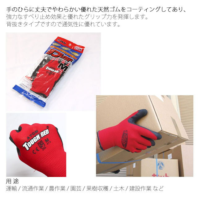 ※一部地域により送料が異なる場合がございます。 詳しくは、【お買い物ガイド】をご覧下さい。 背抜き手袋 すべり止め 手袋 天然ゴム SS S M L 1470 タフレッド アトム背抜き手袋 すべり止め 手袋 天然ゴム SS S M L 1470 タフレッド アトム商品説明メーカー:アトム(株)商品名:タフレッド 滑り止め手袋 作業手袋サイズ展開:SS S M L対象:大人 男性 女性 兼用用途:運送業 倉庫内ピッキング 軽作業 農作業 園芸 果物の摘果・収穫 ほこりを嫌う精密作業 アウトドア キャンプ ガーデニング 等手のひらに天然ゴムコートすべり止めが付いた背抜き手袋柔らかくて軽い手にピッタリ天然ゴムでハイグリップ背抜きで通気性抜群素 材本体:ポリエステル(13ゲージ)すべり止め:天然ゴムサイズ◇ 採寸サイズサイズ/手袋長さ/中指長さ/手のひらまわりSS/19.5cm/7cm/17.0cmS/20.9cm/7cm/18.4cmM/21.9cm/7.6cm/19.0cmL/23.2cm/8cm/20.8cm※仕上り寸は前後0.5cm程の誤差が生じる場合がございます※ 実寸平置きのサイズとなります。多少の誤差はご了承願います。