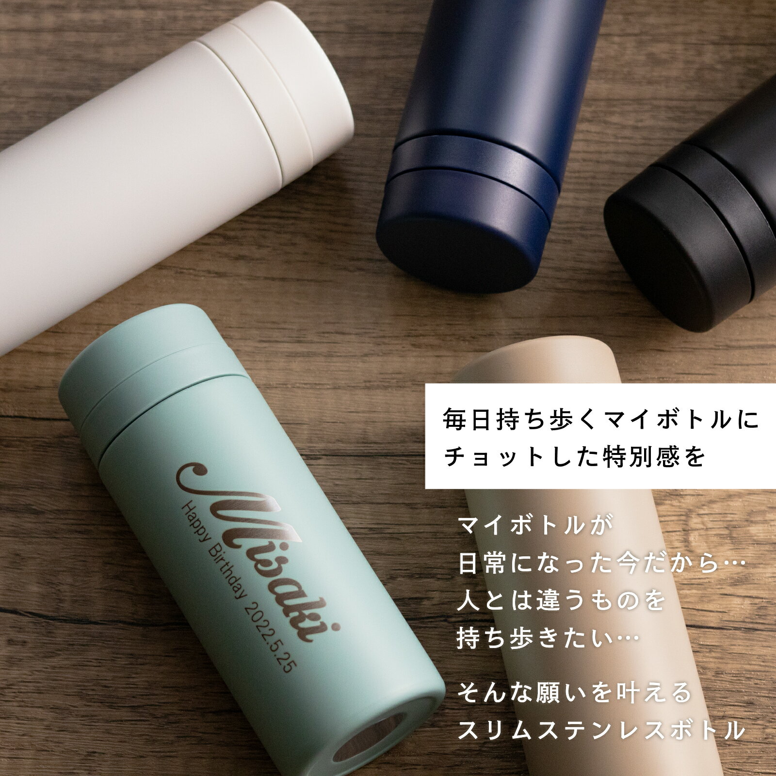 【名入れ プレゼント 熱中症対策】 名入れ無料 スリムサーモ ステンレスボトル 500ml 5色 父の日 プレゼント ブラック/ネイビー/ホワイト/ベージュ/スモークブルー 保冷保温 魔法瓶構造 二重構造 名入れ水筒 名入れケータイマグ オリジナル おすすめ 即日可 Ver2
